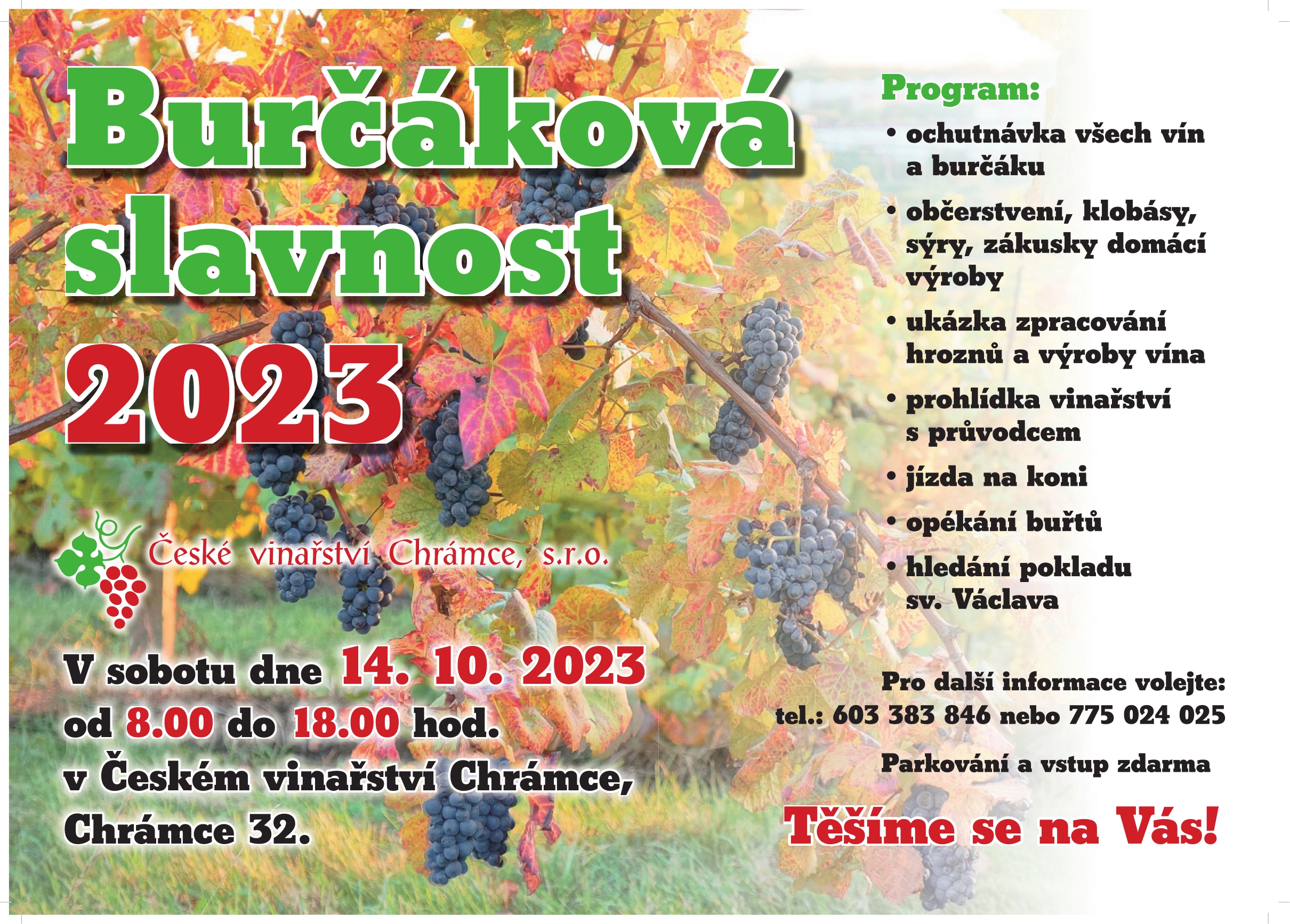 Přijďte si pochutnat na letošním bílém i červeném burčáku či na některém z nepřeberné nabídky vín. Během celého dne budete mít také možnost si projít vinařství za doprovodu znalého průvodce a dozvědět se tak plno zajímavých informací. K tomu všemu na Vás čeká i skvělé občerstvení, opékání buřtů a jízdy na koních pro děti. Parkování v areálu je zdarma.