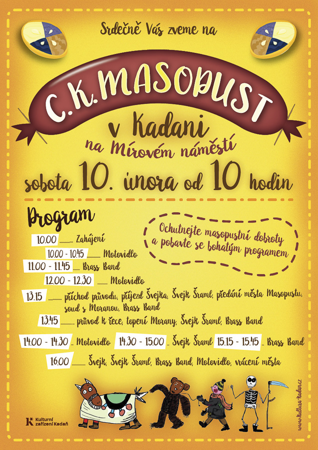 K Masopustu neodmyslitelně patří dobré jídlo, pití a zábava! To všechno na vás samozřejmě v Kadani čeká. Celým dnem vás bude provázet Švejk, ale také hudební kapely Motovidlo a Brass Band hrající k poslechu i tanci.