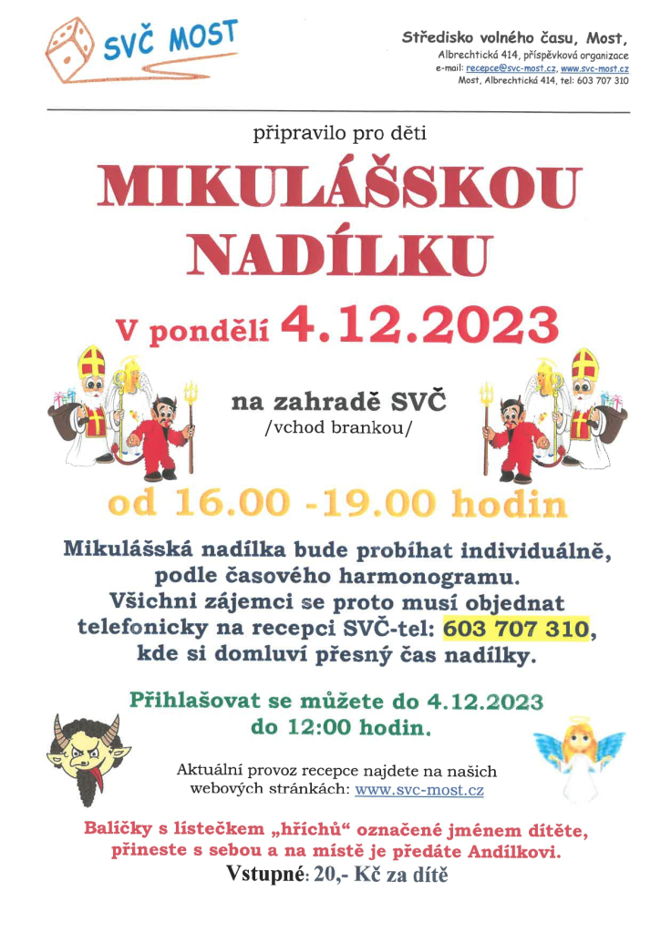 Mikulášská nadílka na zahradě Střediska volného času bude probíhat individuálně. Přihlásit se můžete na recepci SVČ (tel.: 603 707 310), kde si domluvíte konkrétní čas.