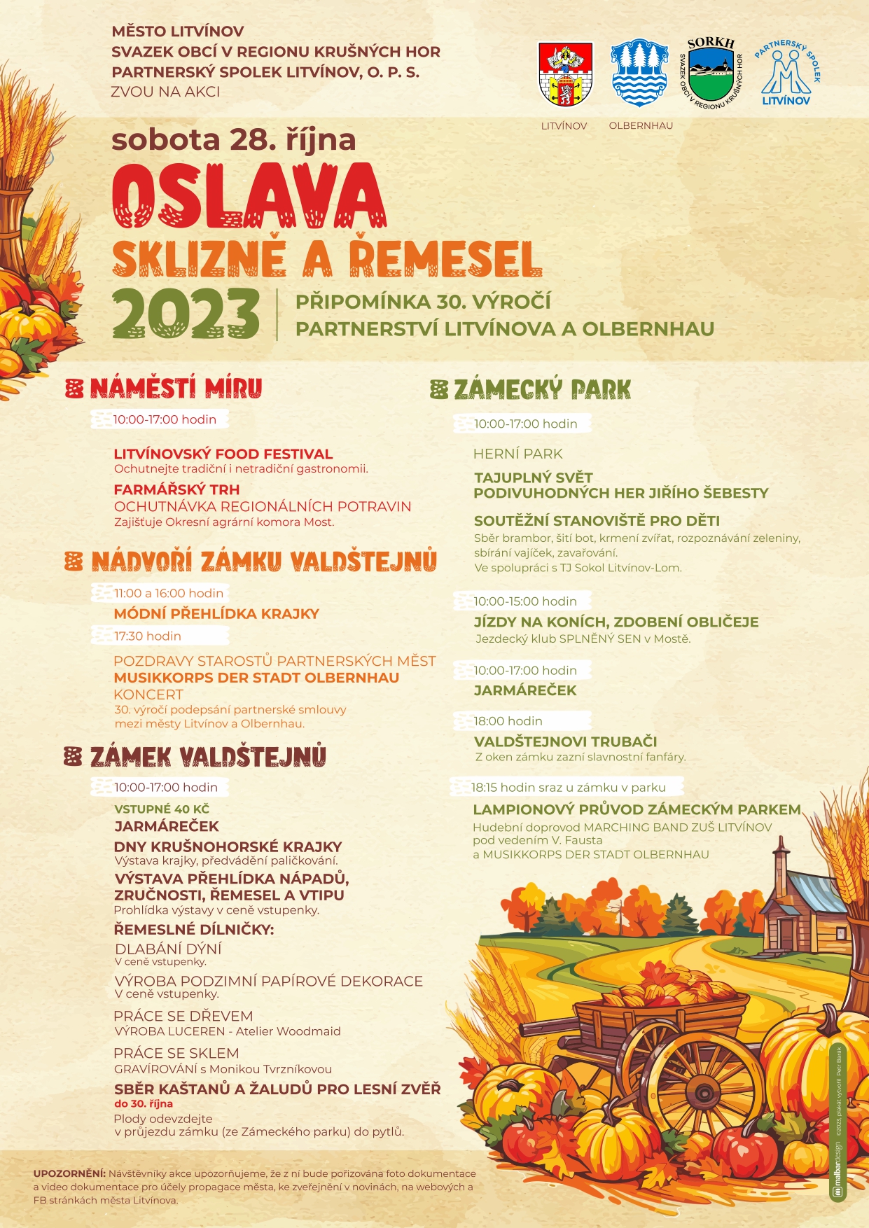 Litvínov - Město Litvínov společně se Svazkem obcí v regionu Krušných hor a partnerský spolek Litvínov přichystalo na sobotu 28. října na akci Oslava sklizně a řemesel. Akce bude zároveň i připomínkou 30. výročí partnerství měst Litvínova německého Olbernhau.