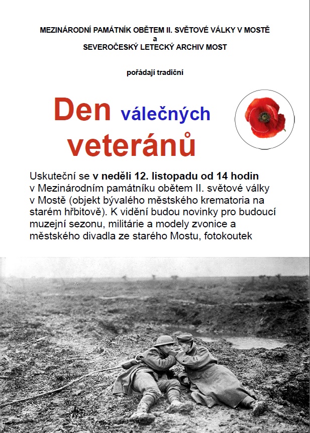Den válečných veteránů se uskuteční v Mostě nicméně až v neděli 12. listopadu. Památník, který se nachází v objektu bývalého městského krematoria na starém hřbitově, bude zpřístupněn od 14 do 16 hodin. Při pietní akci si návštěvníci budou moci prohlédnout některé z novinek pro budoucí muzejní sezonu. „K vidění budou nově například kožené kalhoty s tzv. padacím mostem. Odhadujeme, že jsou tak z roku 1941. Našli se na půdě jednoho domu na Mostecku," láká na jednu z novinek Edvard D. Beneš.
