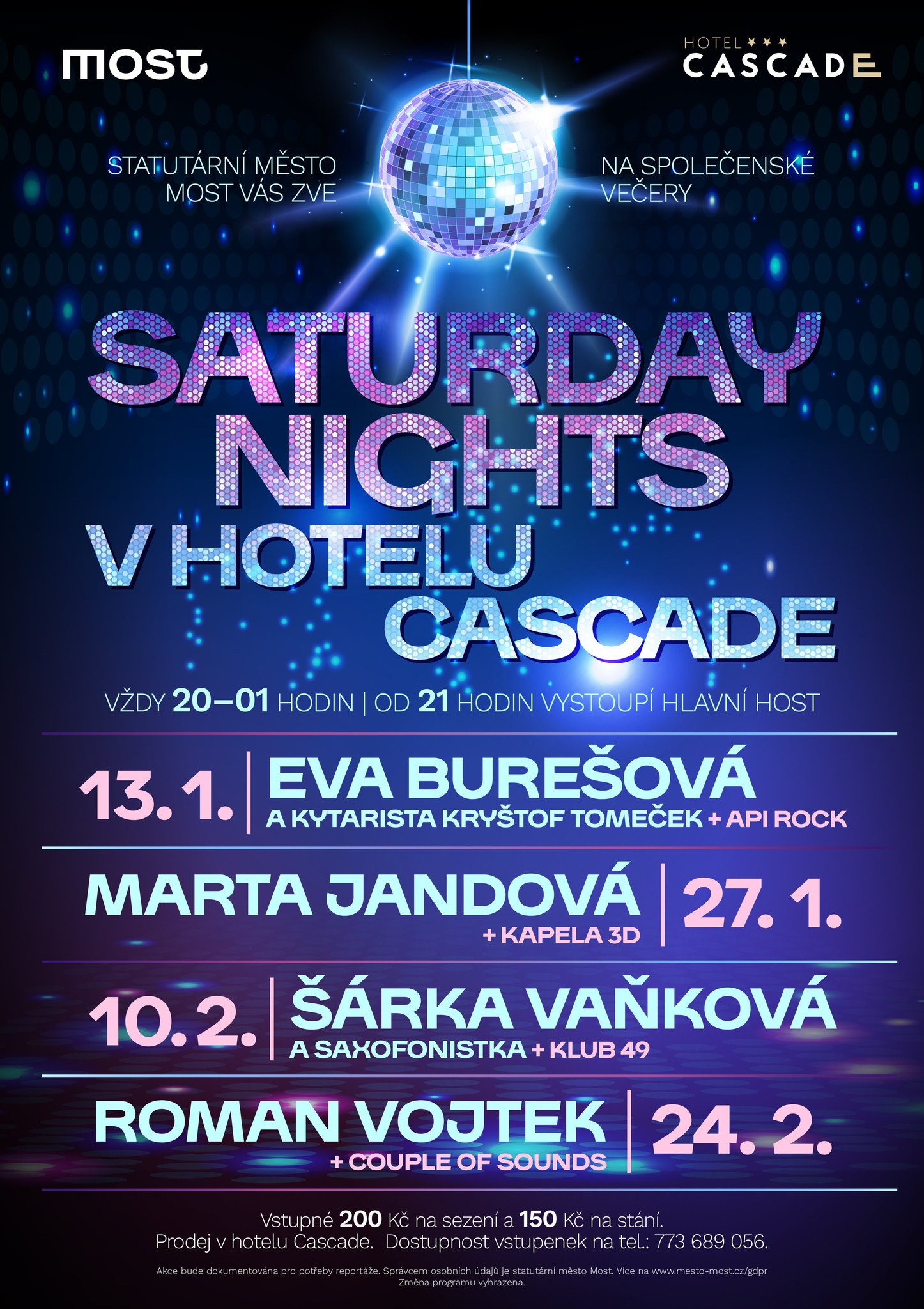 Most – Už příští sobotu budou zahájeny společenské večery v hotelu Cascade s názvem Saturday Nights. Večery pořádá statutární město Most, které láká na zvučná jména českých zpěváků a zpěvaček.