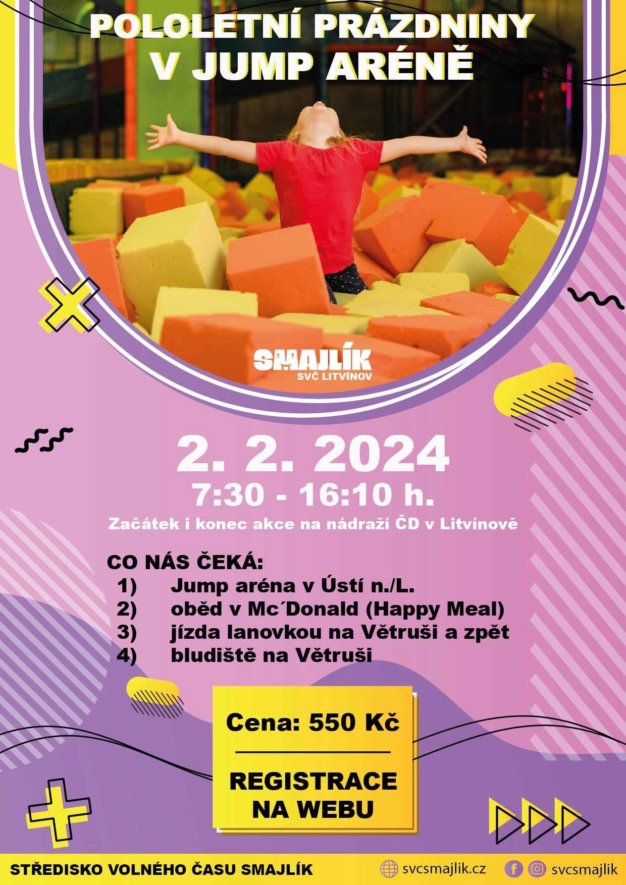 Pořadatelé hlásí, že stále ještě zbývají volná místa. „Akce je určena dětem od 7 do 12 let a program je opravdu bohatý. Vyrazíme nejprve do Ústí nad Labem, kde se vyřádíme v Jump aréně, po takovém výkonu si děti zaslouží odměnu v podobě obědu v McDonald´s. Po obědě se svezeme lanovkou na Větruši, kde si užijeme zábavu v bludišti," popsala program vedoucí Monika Merhautová.
