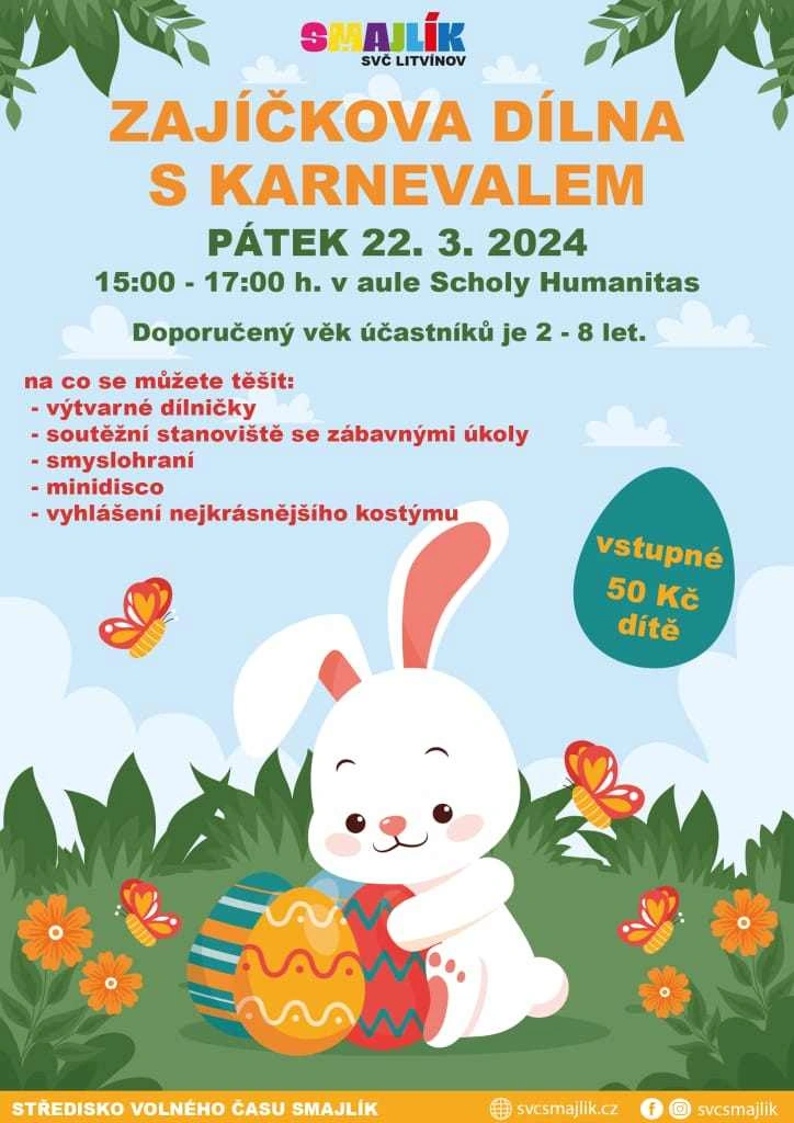 Středisko volného času Smajlík Litvínov na pátek připravilo Zajíčkovu dílnu. V aule Scholy Humanitas budou připraveny dílničky, soutěžní stanoviště s úkoly i minidisco v maskách, a to od 15 do 17 hodin. „Na středu jsme pro kolektivy z mateřinek a základních škol připravily v areálu parku Nové Záluží Stezku za vajíčkem, tedy zábavné putování s plněním úkolů a hrami s velikonoční tematikou. Vychází se od parkoviště v ulici Jandečkova. Kolektivy mohou přicházet od 9 hodin," láká na hravé dopoledne Monika Merhautová.