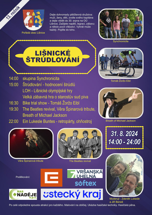 Lišnické štrúdlování ale není jen o této klasické pochoutce. Návštěvníci akce mohou soutěžit i třeba na lišnické olympiádě, k zábavě budou hrát hudební kapely. Více v plakátku pod článkem.