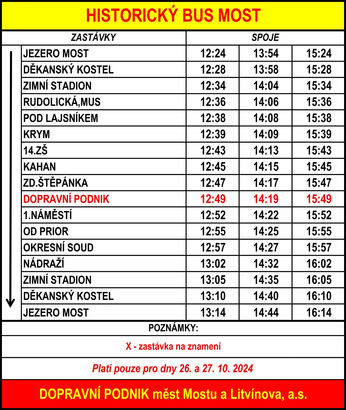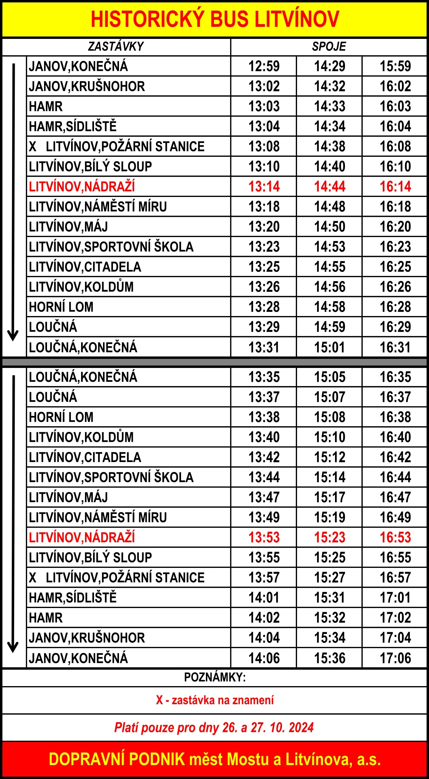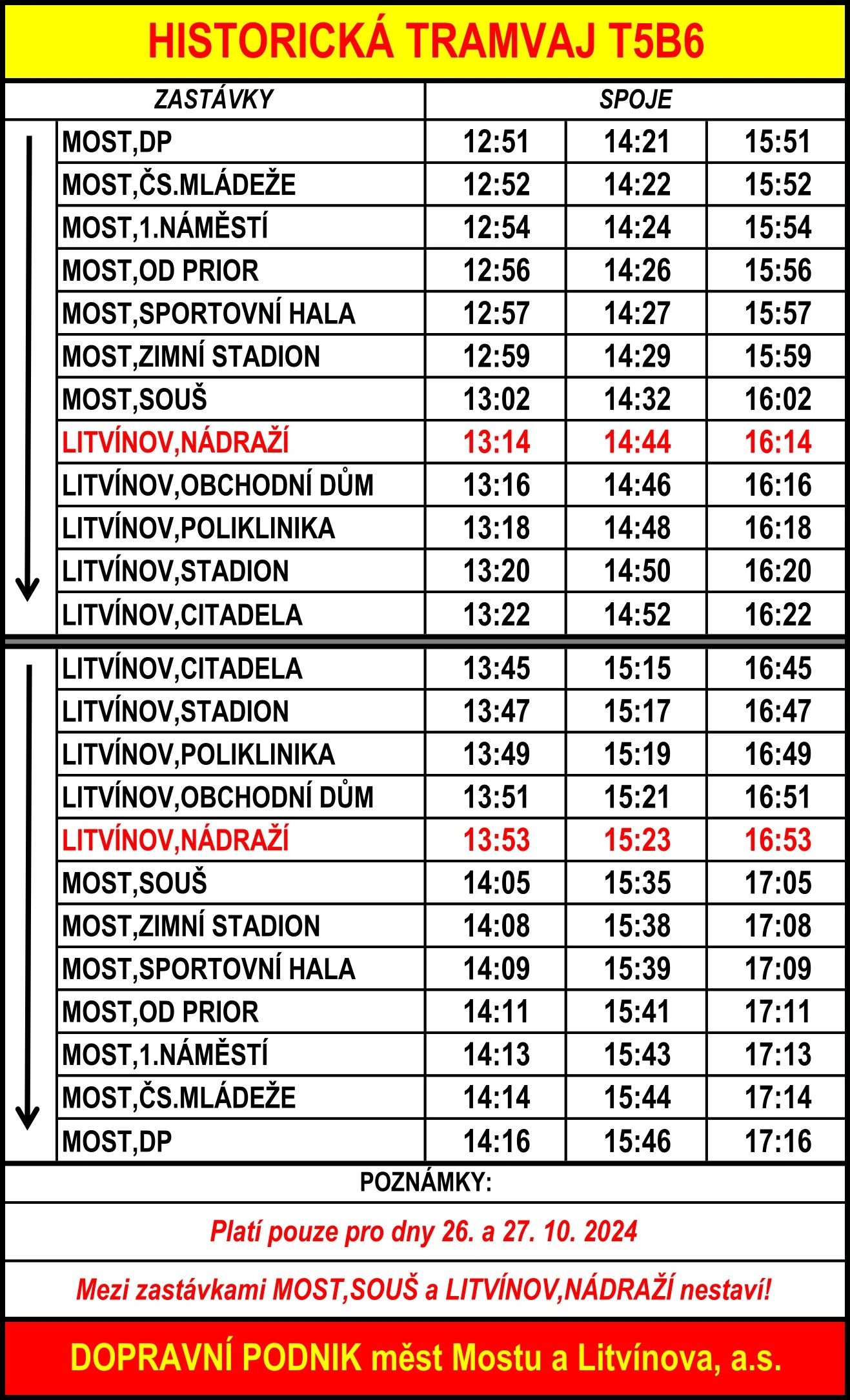 Našimi veterány se můžete svézt v sobotu a neděli 26. a 27. října v odpoledních časech dle speciálních jízdních řádů a přeprava bude v těchto vozech zdarma. Historická tramvaj bude jezdit po oba dva dny na meziměstské trase, přičemž nebude stavět mezi zastávkami Most, Souš a Litvínov, nádraží.