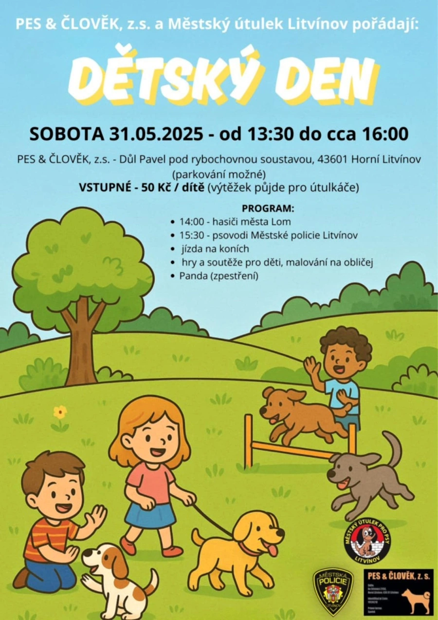 V sobotu 31. května se Dětský den uskuteční v prostoru bývalého dolu Pavel pod rybochovnou soustavou, kde můžete i zaparkovat. I zde je vstupné za dítko 50 korun, přičemž výtěžek bude věnován na péči o psy v městském útulku. Akci totiž společně pořádají dobrovolníci z uskupení Člověk & pes a zaměstnanci již zmiňovaného útulku.