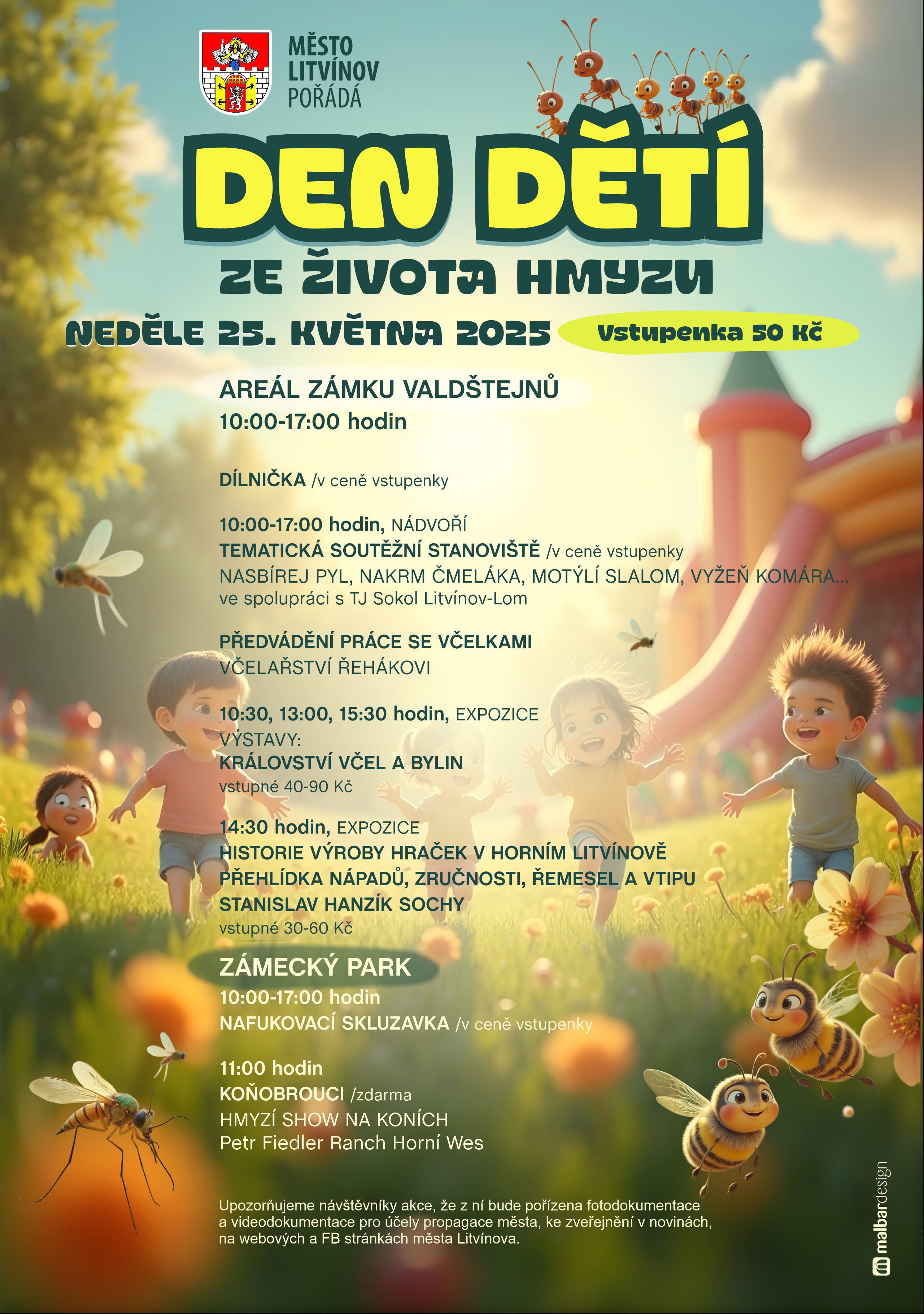 Nedělní akci v areálu zámku Valdštejnů chystá město. Oslava s množstvím soutěžních disciplín pro děti odstartuje v 10 hodin a veselo bude až do 17 hodin. Těšit se můžete na nejrůznější úkoly jako je motýlí slalom, sbírání obřího pylu či krmení čmeláků. Po celý den bude v Zámeckém parku postavena obří nafukovací skluzavka, ale hlavně si nenechte v 11 hodin ujít hmyzí show na koník s názvem Koňobrouci v podání jezdců a koní z Ranche Horní Wes.