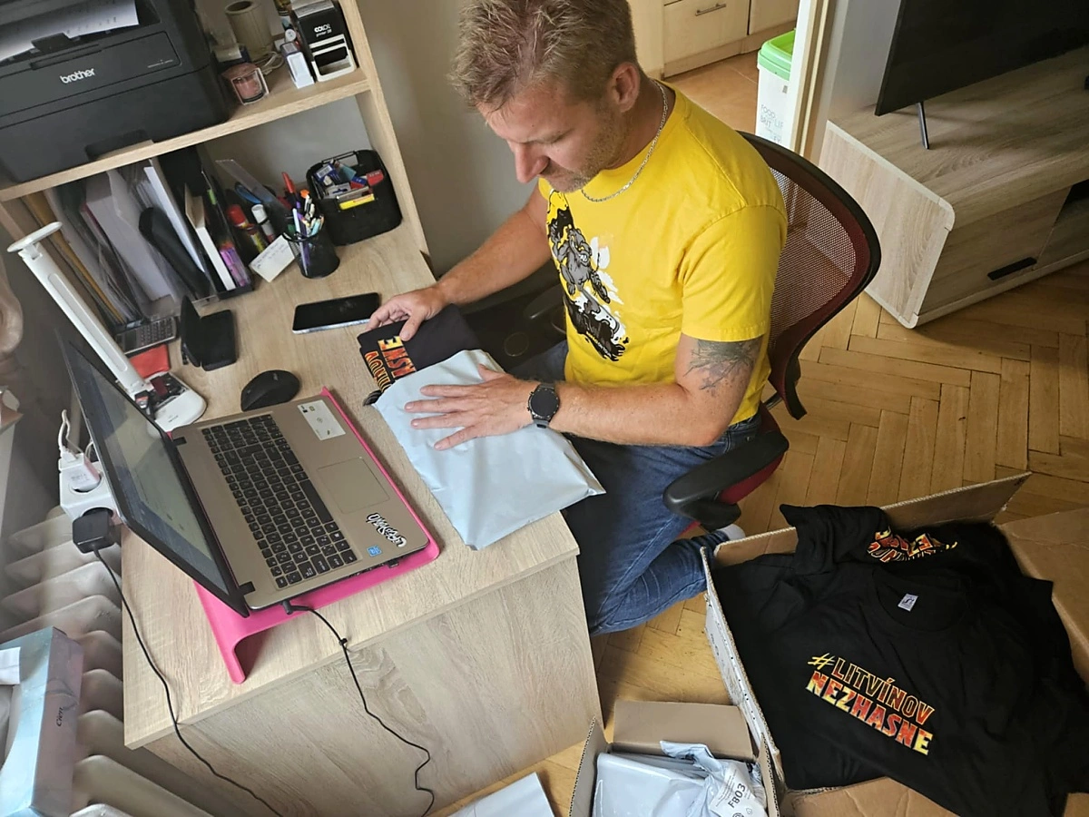 Ne všichni mají možnost koupit si triko s logem Litvínov nezhasne před zápasem nebo jiných akcích fanklubu Ropáci on Tour, a objednávají si je přes e-shop. Obývák předsedy fanklubu se tak proměnil v balicí centrum a Jan Ptáček si vyzkoušel novou roli. Foto: jip