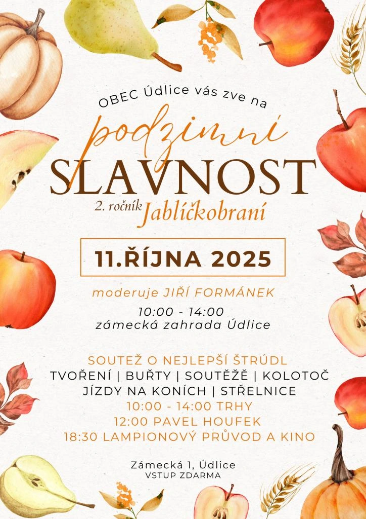 Údlice – Zámecká zahrada v Údlicích se opět po roce stane dějištěm oblíbené Podzimní slavnosti, jejíž druhý ročník nese podtitul Jablíčkobraní. V sobotu 11. října 2025 se můžete od 10:00 do 14:00 těšit na den plný zábavy, tvoření, skvělého jídla a příjemné atmosféry pro celou rodinu.