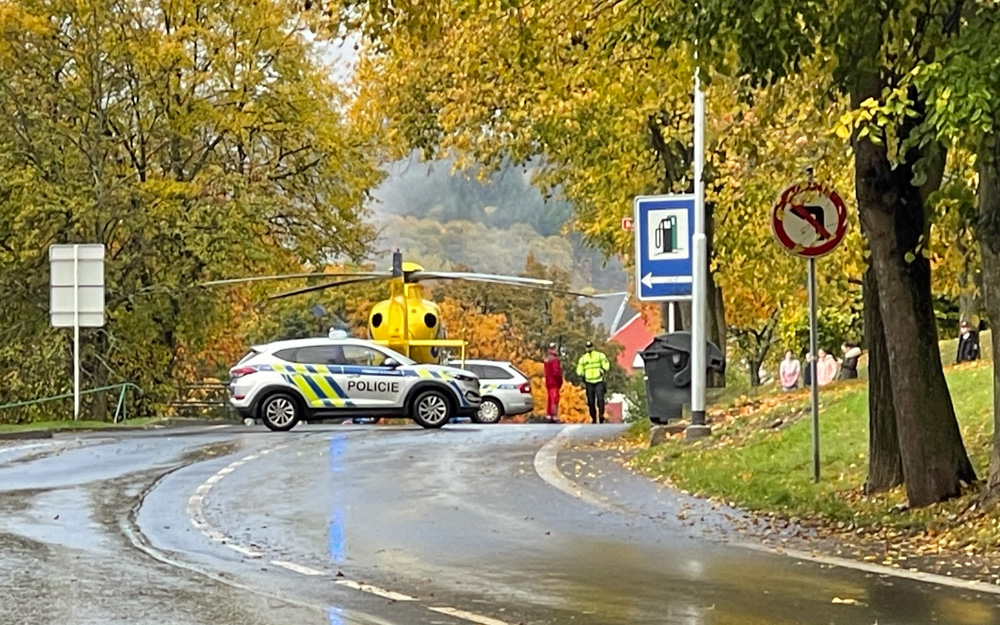 Helikoptéra dosedla na křižovatce Okružní ulice a Hornické ulice u čerpací stanice pohonných hmot. Policisté příjezdové cesty kvůli přistání stroje uzavřeli.