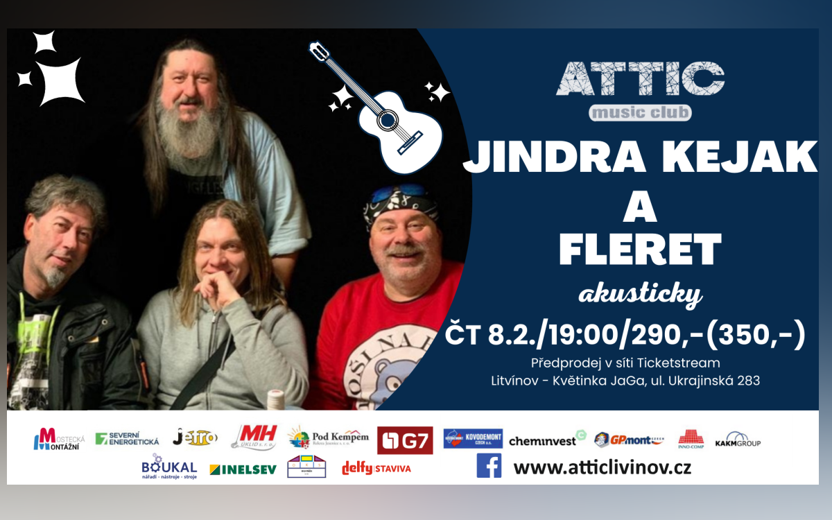 Litvínov – Dnes večer zahajuje hudební klub Attic Litvínov sérii letošních koncertů folkovým večerem s Jindrou Kejakem a kapelou Fleret. Čtenáři E-deníků mohli soutěžit o čtyři volné vstupenky.