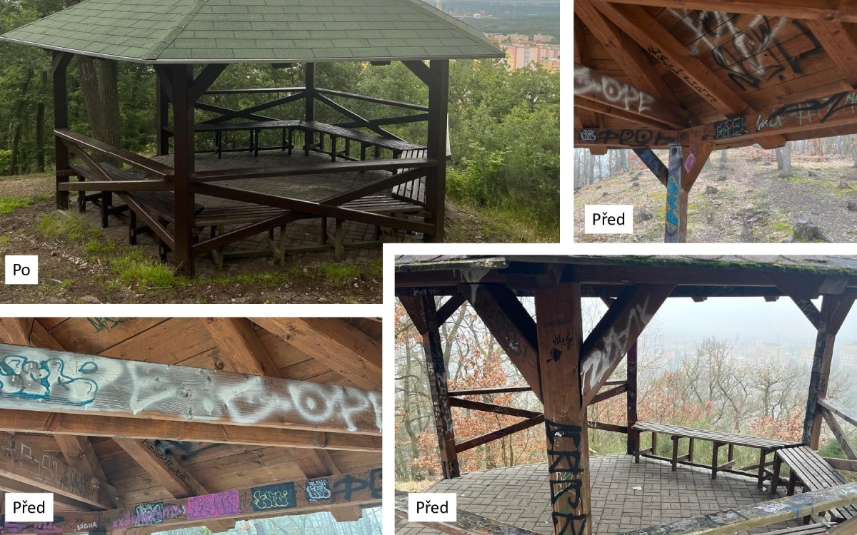 Nový nátěr téměř ještě nestihl zaschnout a už jsou ve dřevě vyryty nové nápisy. Přitom si lesníci dali s opravou altánu a vybavení takovou práci. Zdroj: Lesní správa Litvínov
