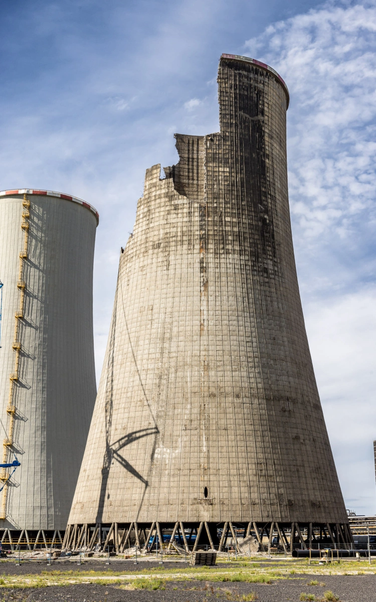 Stometrové chladicí věže sloužily k ochlazení vody oteplené ve výrobních technologiích jednotek v rafinérské části závodu. Postupnými změnami ve výrobních procesech došlo ke snížení potřebné chladicí kapacity. Z důvodu blízkosti dalších technologií není odstřel věží možný, proto budou postupně rozebrány.