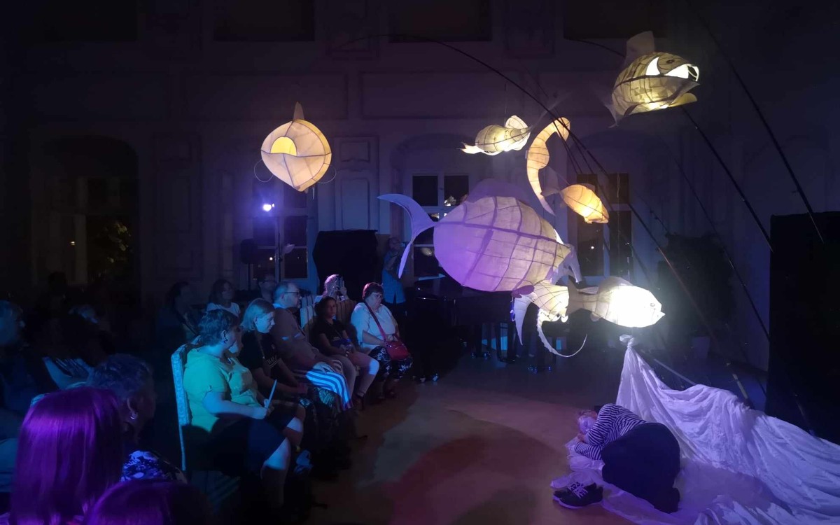 Sál zámku Valdštejnů postupně zaplnily světelné loutky podmořského světa. Tvůrce Jan Kindl do přestavení zapojil i diváky, kteří pomocí rybářských prutů nechávali jednotlivé mořské tvory „plout“ nad hlavami ostatních diváků. Foto: jip