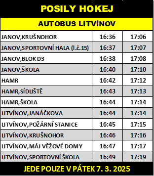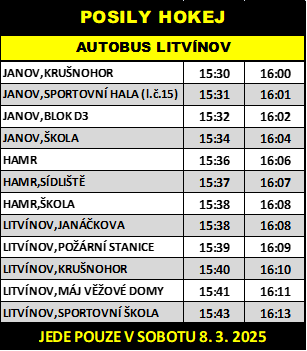 První autobus pojede po skončení utkání ze zastávky Litvínov, sportovní škola a druhý pojede z této zastávky cca o 30 minut později. Trasa autobusu bude do zastávky Litvínov, Máj věžové domy, a dále po trase linky č. 15 až do zastávky Janov, škola.
