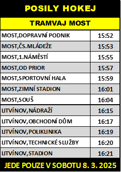 Tramvajová posila pojede po skončení utkání ze zastávky Litvínov, stadion směr Most až do zastávky Most, Velebudická. Mezi zastávkami Litvínov, nádraží a Most, Souš nebude zastavovat na žádných zastávkách.