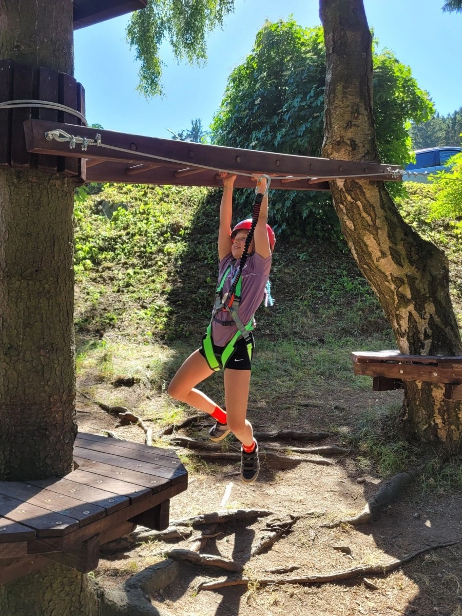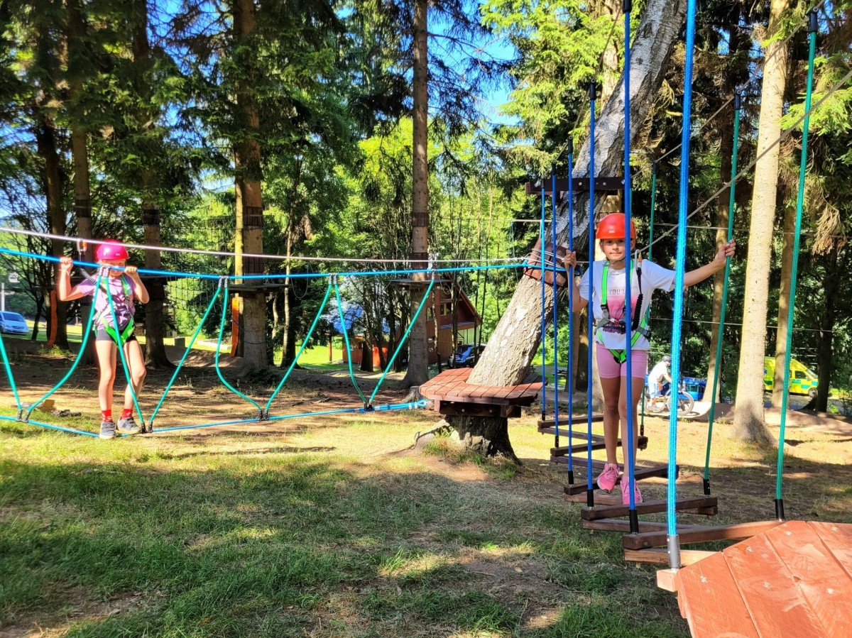„Lanáček je s jištěním, takže děti si potrénují nejen sílu, obratnost a rovnováhu, ale také zručnost s karabinou a starost o vlastní bezpečnost. Větší děti a dospělí mohou využít vysoký lanový park! Naši instruktoři se na Vás těší!" hlásá Sportareál Klíny. Tak hurá na hory.
