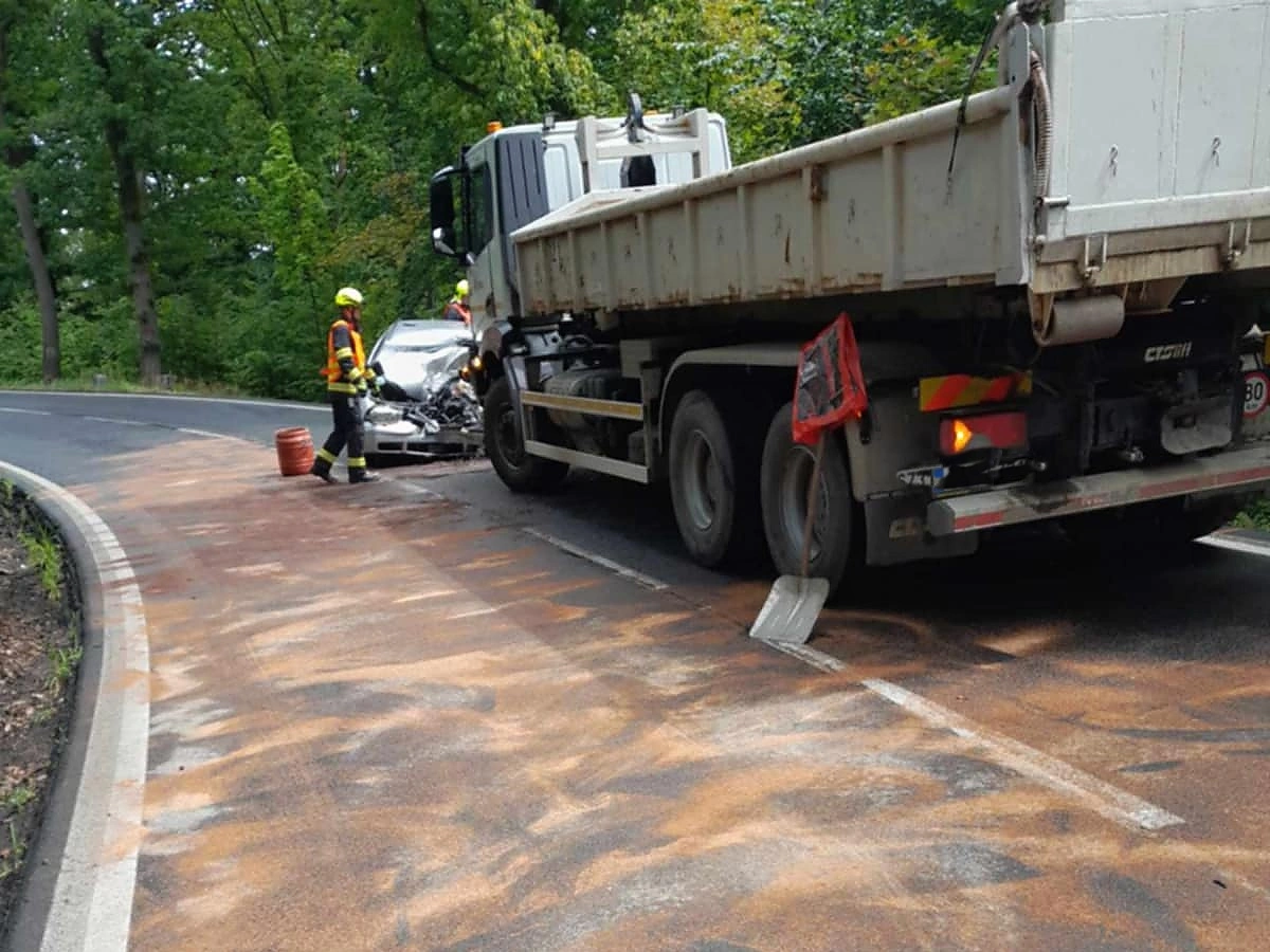 Litvínov – Tři hodiny od nehody, ke které došlo v pravé poledne na silici z Litvínova na Klíny, je tamní silnice stále uzavřená. Podle prvních informací z místa uklouzl osobní vůz na olejové skvrně a následně se čelně střetl s protijedoucím nákladním vozem.
