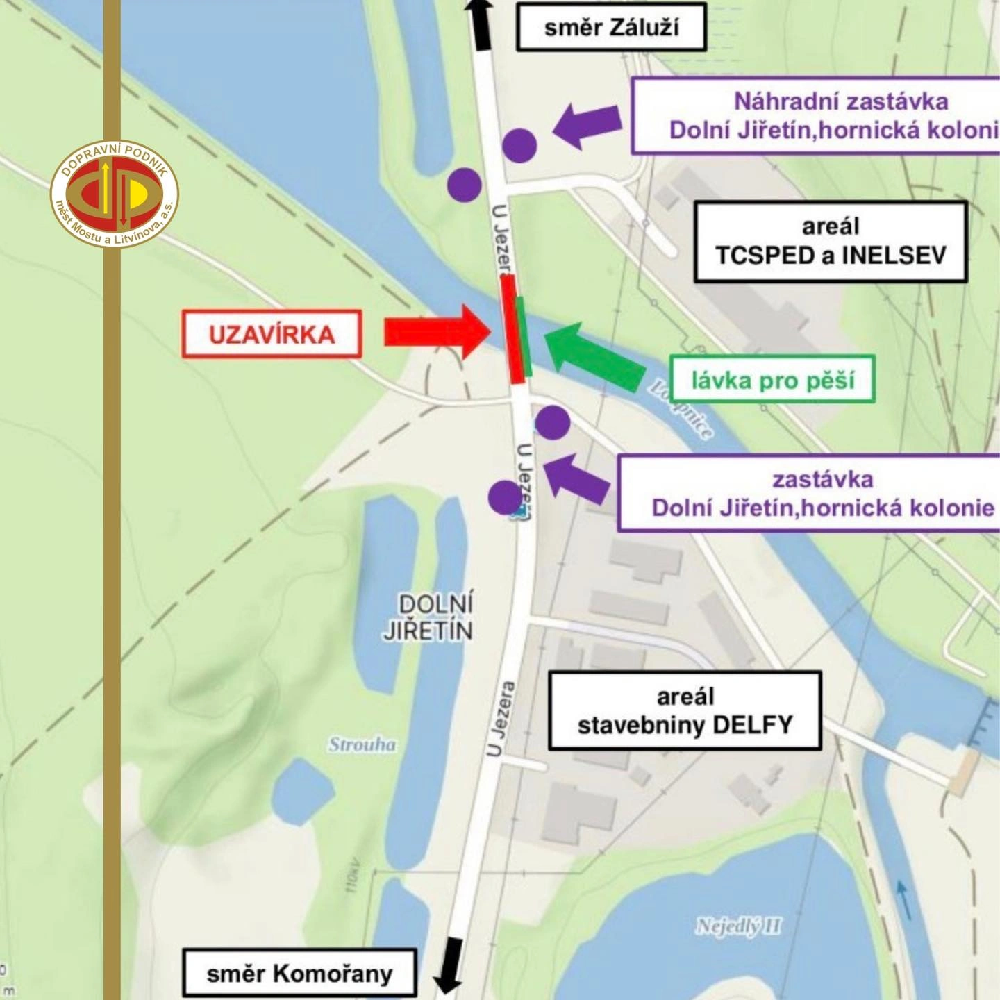 Důvodem uzavírky je oprava mostku přes potok Loupnice. Uzavírka ovlivní i provoz linky číslo 12 DOPRAVNÍHO PODNIKU měst Mostu a Litvínova. Od středy tak všechny spoje této linky jedoucí ze směru od Mostu a Komořan do Litvínova, Záluží budou ukončeny v zastávce Dolní Jiřetín, hornická kolonie (u areálu stavebnin DELFY). Cestující pokračující dále do Litvínova, Záluží vystoupí a přejdou lávku přes potok do náhradní zastávky, která bude umístěna u vjezdu k areálu společnosti TCSPED a INELSEV. Z ní bude zajištěna kyvadlová doprava do Litvínova, Záluží.