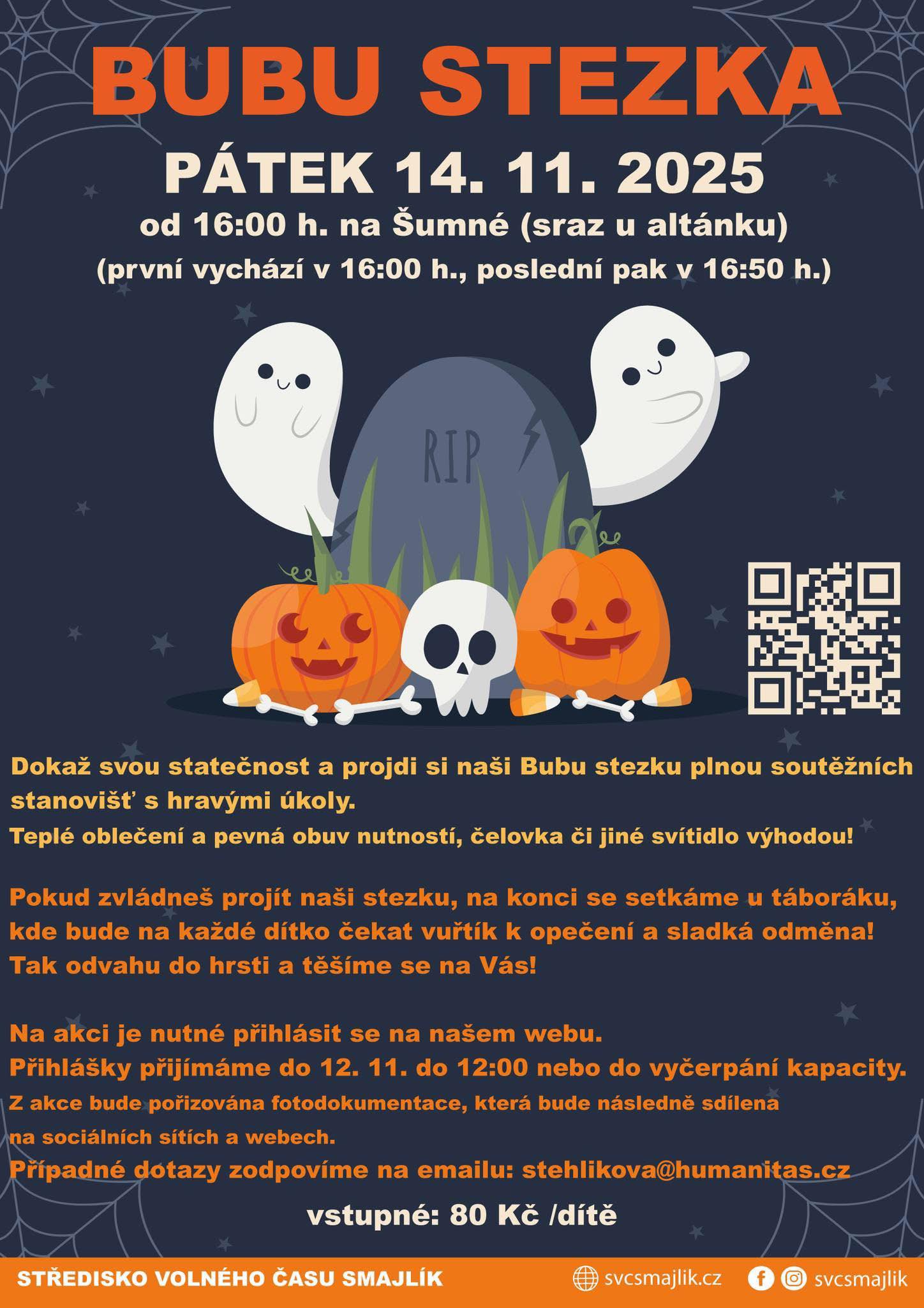 Na děti čeká stezka plná soutěžních stanovišť a hravých úkolů, kde prokážou svou statečnost. Protože se akce koná po setmění, organizátoři připomínají, že teplé oblečení a pevná obuv jsou nutností. Výhodou bude také vlastní čelovka nebo jiná baterka.