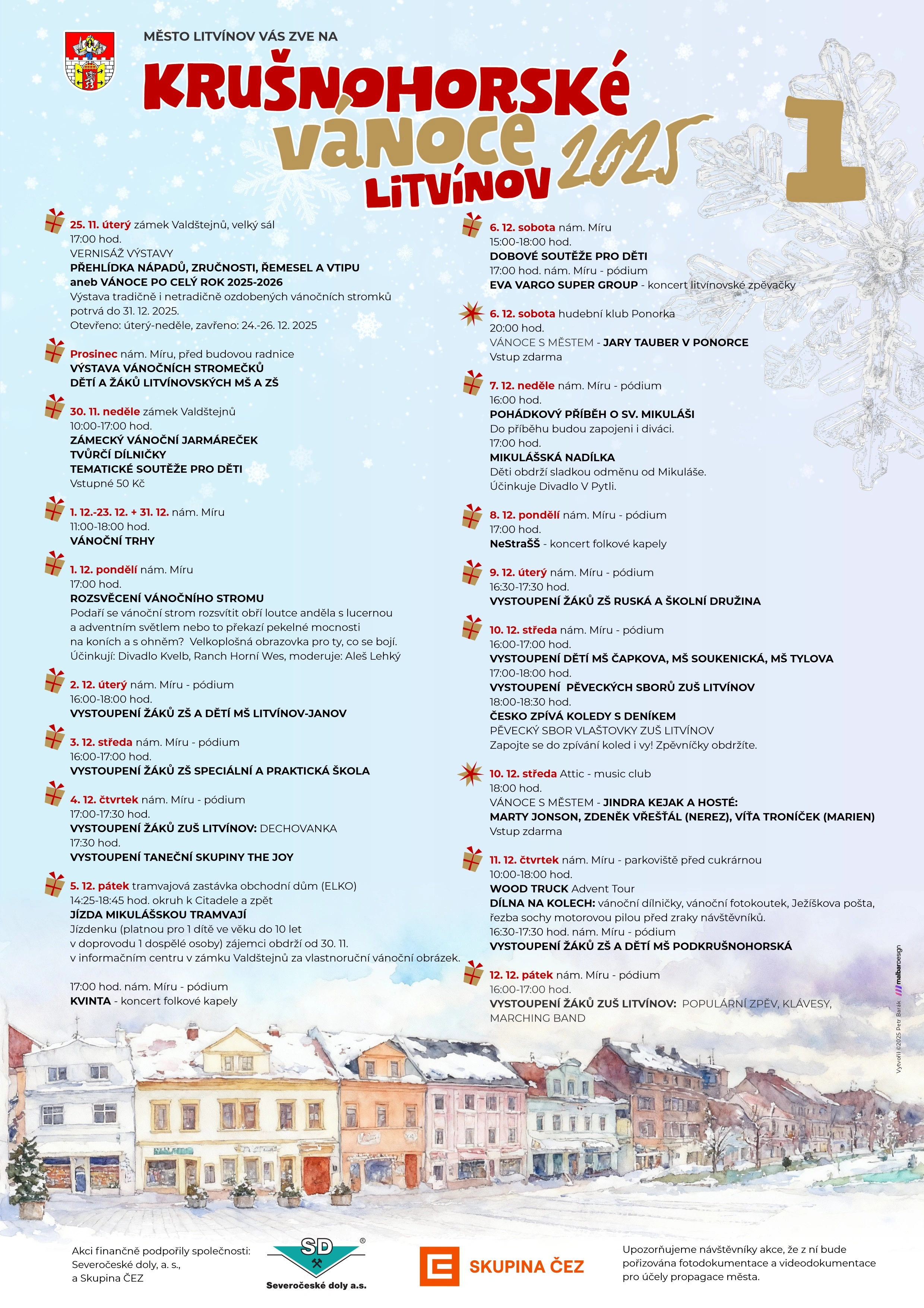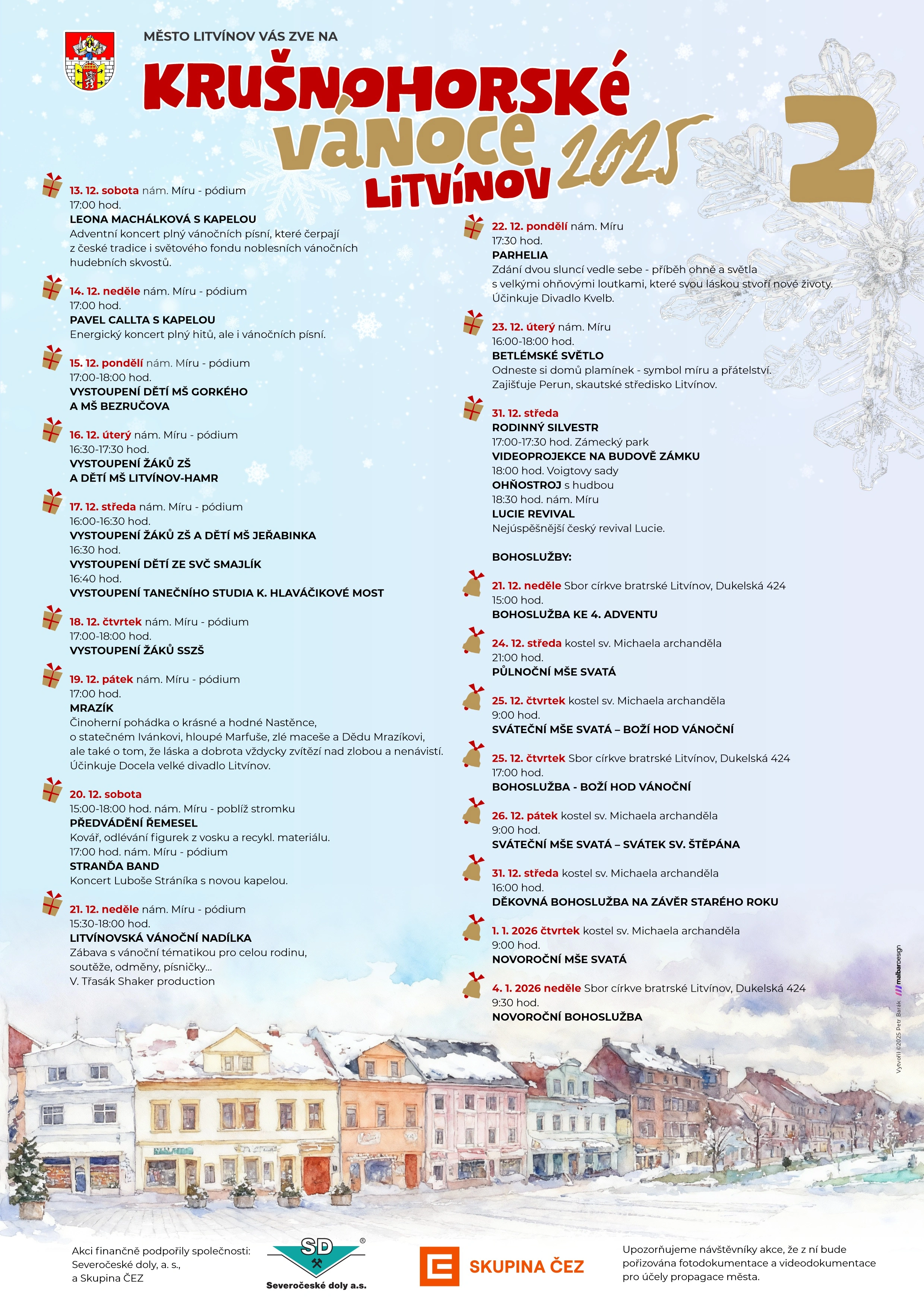 Litvínov – Adventní čas se blíží a Litvínov je připraven. Letošní ročník Krušnohorských Vánoc slibuje nejen tradiční trhy a rozsvícení stromu, ale také zvučná hudební jména. Město si navíc pro své obyvatele a návštěvníky připravilo jednu specialitu – zatímco řada okolních měst na Mostecku od zábavní pyrotechniky upouští, Litvínov přivítá nový rok velkolepým oficiálním ohňostrojem.