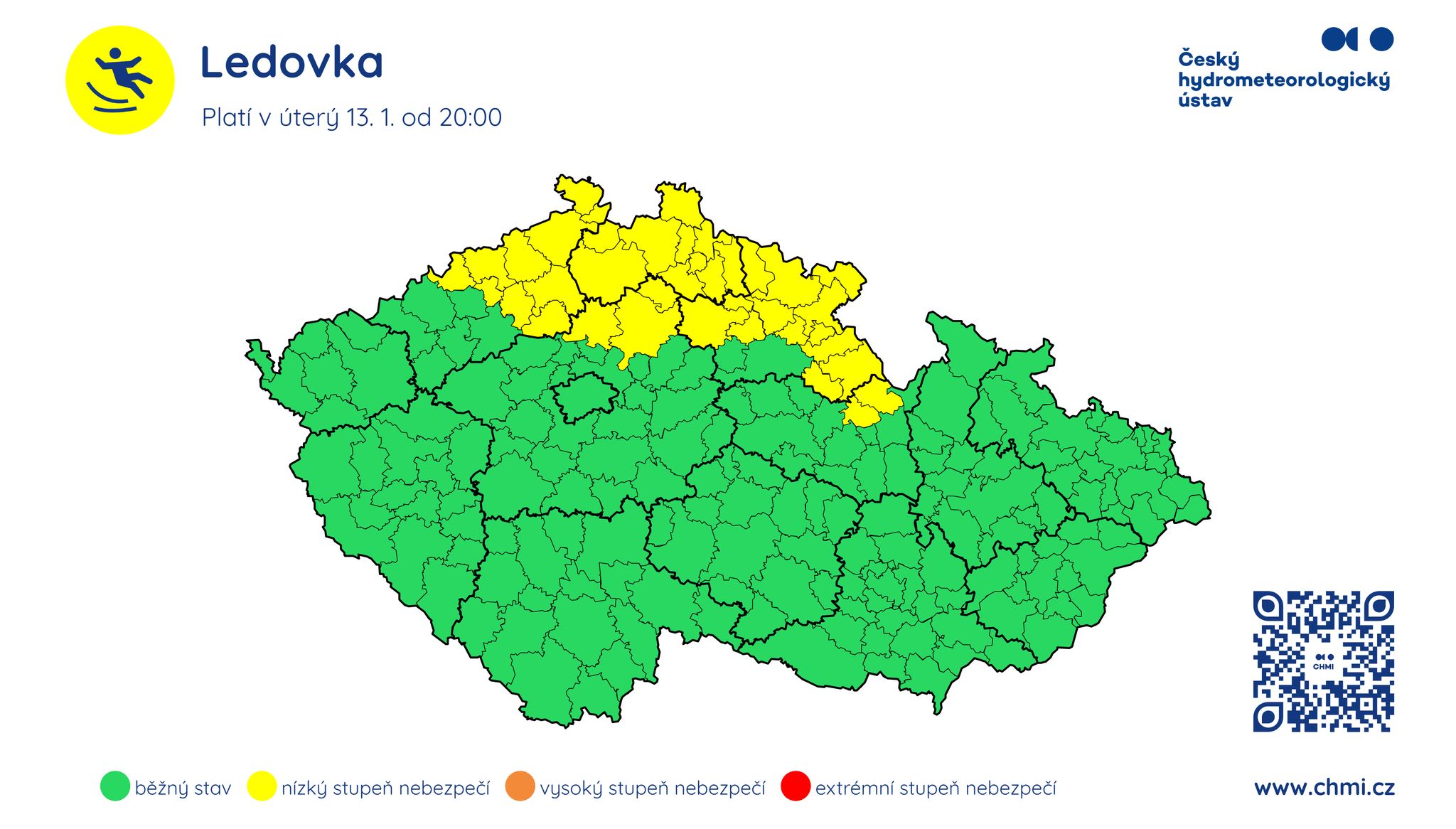 Situace na severu Čech zůstává napjatá. Během úterního večera (13. 1.) a noci na středu (14. 1.) zasáhne severní polovinu území déšť. Vzhledem k teplotám, které se pohybují kolem nuly, bude voda na podchlazeném povrchu okamžitě namrzat.