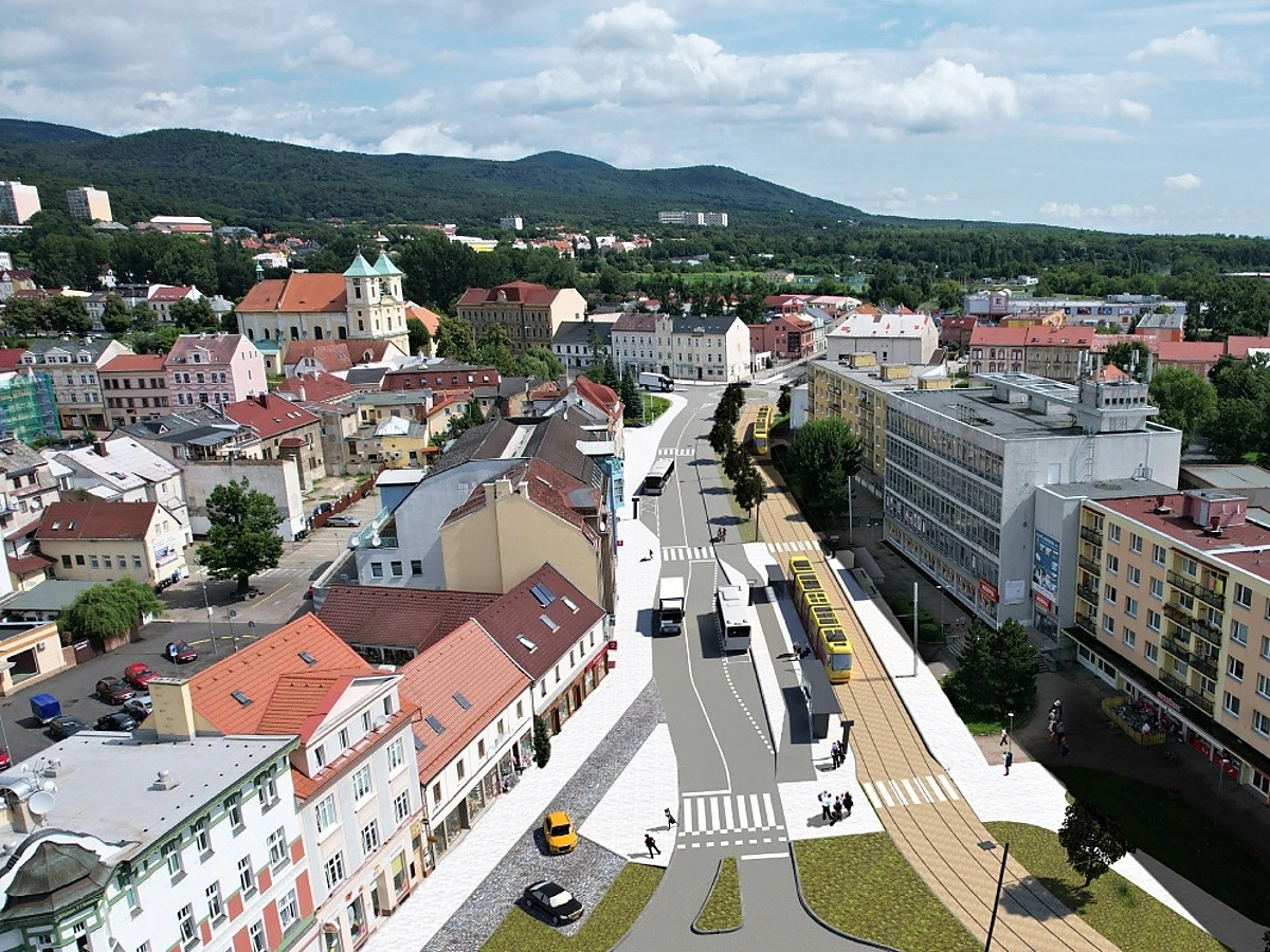 - Kruhový objezd s preferencí: Největší změnou projde křižovatka ulic 9. května, Tržní, Jiráskova a Smetanova. Vznikne zde kruhový objezd protnutý kolejemi. Semafory zajistí, že když pojede tramvaj, auta dostanou červenou.