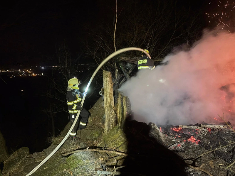 Horní Jiřetín, Černice - V sobotu 7. března ve večerních hodinách vyjížděla jednotka dobrovolných hasičů z Horního Jiřetína k požáru na Černickém vrchu. V plamenech se tu ocitl trampský srub Yucatan.