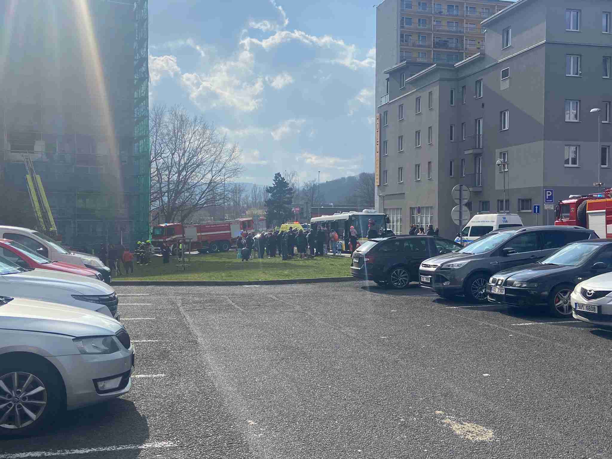 „Aktuálně probíhá evakuace obyvatel z horních pater. Byl vyhlášen 1. stupeň požárního poplachu,“ uvedl mluvčí hasičů. Pro evakuované byl přistaven autobus, kde se můžou ohřát.