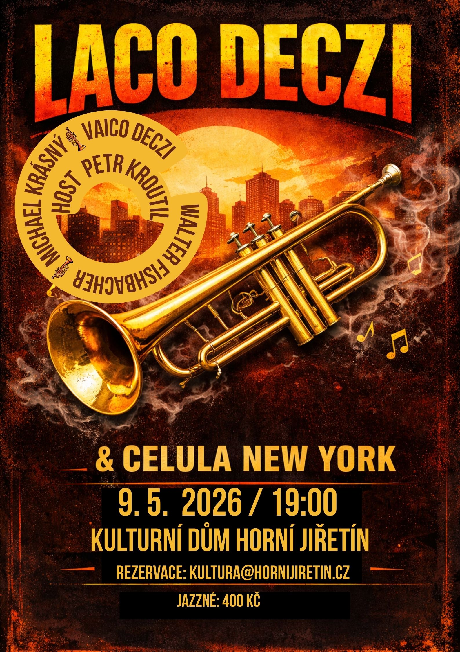 Návštěvníci koncertu se mohou opět těšit na mimořádný hudební zážitek a jedinečnou atmosféru, kterou dokáže tento charismatický hudebník na pódiu vytvořit. Laco Deczi vystoupí tradičně s kapelou Celula New York a do Horního Jiřetína přiveze i hudebníka Petra Kroutila.