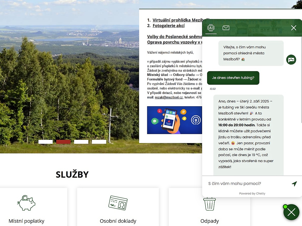 Meziboří – Stejně jako je tomu v Mostě, i v Meziboří mohou lidé při vyhledávání informací na webu města využívat pomoci umělé inteligence. Takzvaný chatbot funguje na webu města od 1. září.