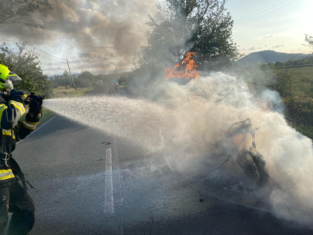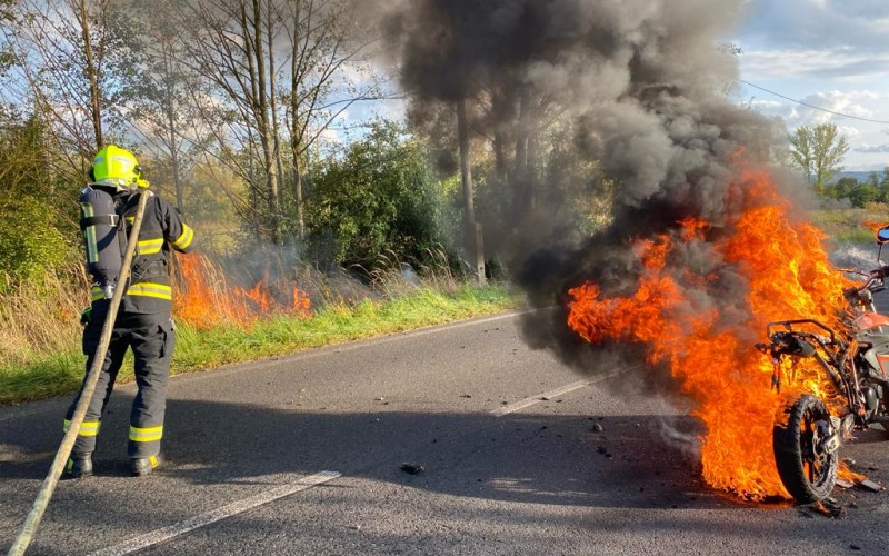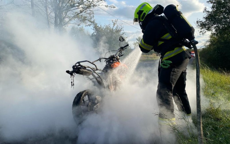 Oheň se z jednostopého vozidla přesunul i na okolní porost. Během jedenácti minut zlikvidovali hasiči plameny jak na motocyklu, tak na trávě.