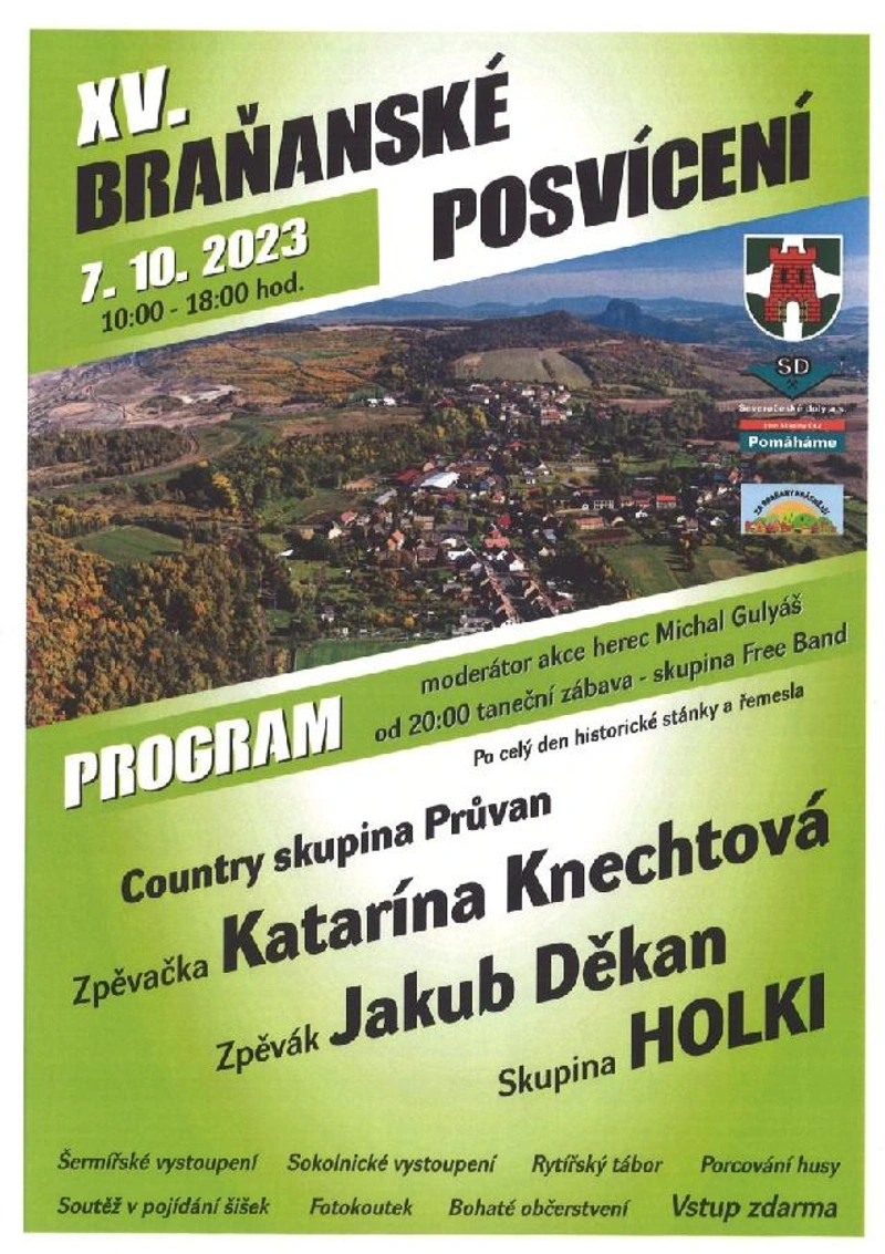 Nenechte si proto XV. ročník Braňanského posvícení ujít. Letos se obec chlubí velice vydařeným programem, navíc má být nádherné počasí. Program začíná v 10 hodin. Představí se šermíři, sokolníci až ze Slovenska, v pravé poledne bude pódium patřit zpěvákovi Jakubovi Děkanovi, ve 13.20 odstartuje soutěž v pojídání šišek, po ní je přichystaný koncert skupiny Holki, ve 14.50 hod. začne tolik očekávané porcování husy. V pět hodin večer vystoupí hlavní hvězda, a to zpěvačka Katarína Knechtová se svojí kapelou. Po celý den budou v areálu stánky a ukázka středověkých řemesel.
