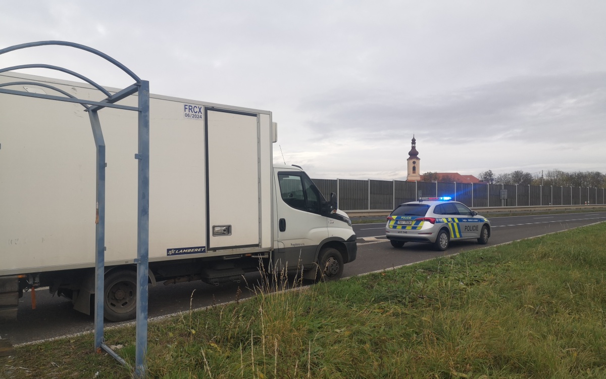 Policista doprovodí řidiče této dodávky na odstavné parkoviště, kde musí její řidič počkat na kolegu, který převezme část jeho nákladu. Foto: jip