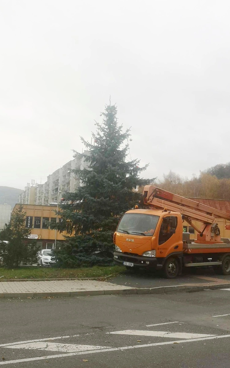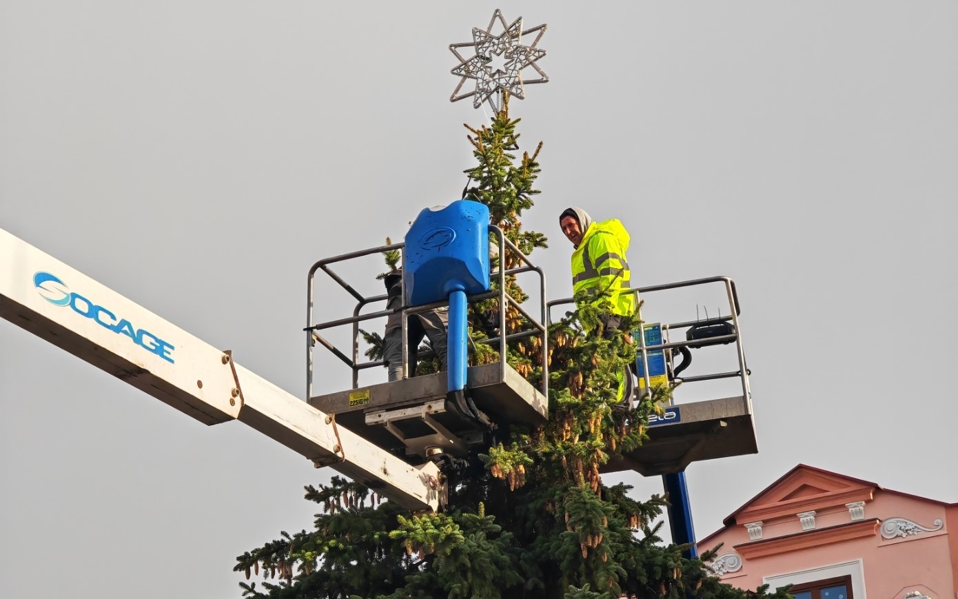 Hned po pokácení, převozu a umístění na náměstí Míru se pracovníci Technických služeb Litvínov pustili do jeho zdobení. Foto: město Litvínov
