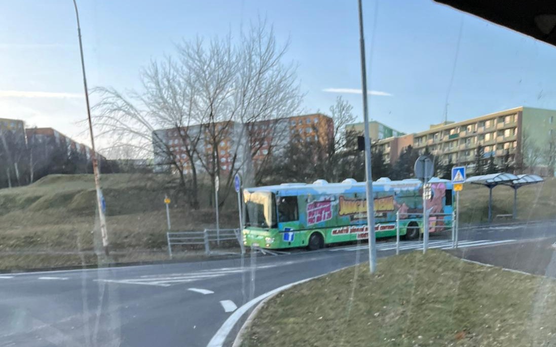 Most – Zelený autobus s reklamou na Jungle arénu v Mostě stojí v kopci v ulici Jana Palacha zabrzděný o zábradlí. A to hned za zastávkou MHD Sukova, blok 558.