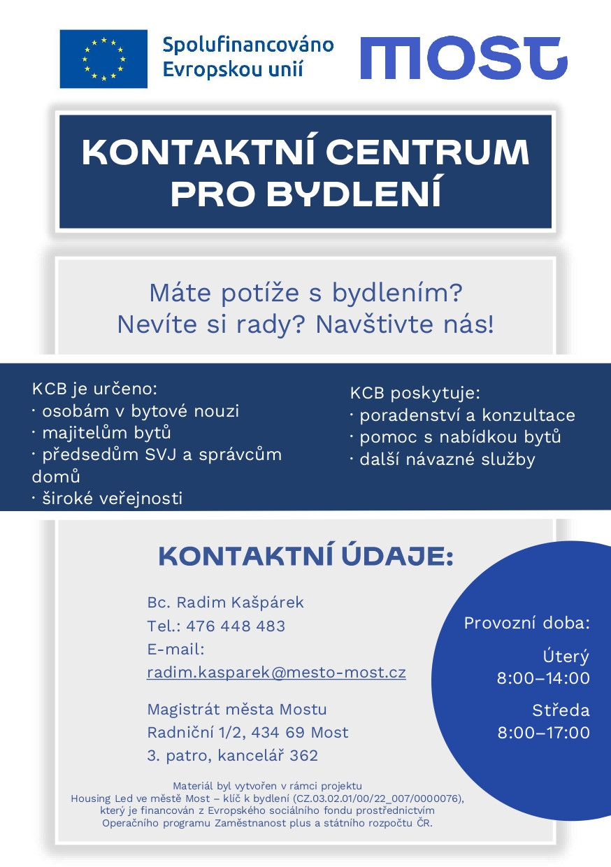 Napříč projekty vzniklo také 16 kontaktních míst pro bydlení, které jsou důležitým prvkem lokální pomoci v bytové nouzi. Jedno z nich je i v Mostě – je provozováno v prostorách Magistrátu města Mostu. „Všechny tyto prvky – využívání soukromých bytů při zajištění asistence v bydlení, zprostředkování bydlení a kontaktní místa představují základní pilíře připravovaného zákona o podpoře v bydlení, na němž MPSV s MMR intenzivně pracuje,“ dodala náměstkyně člena vlády Zuzana Freitas Lopesová.