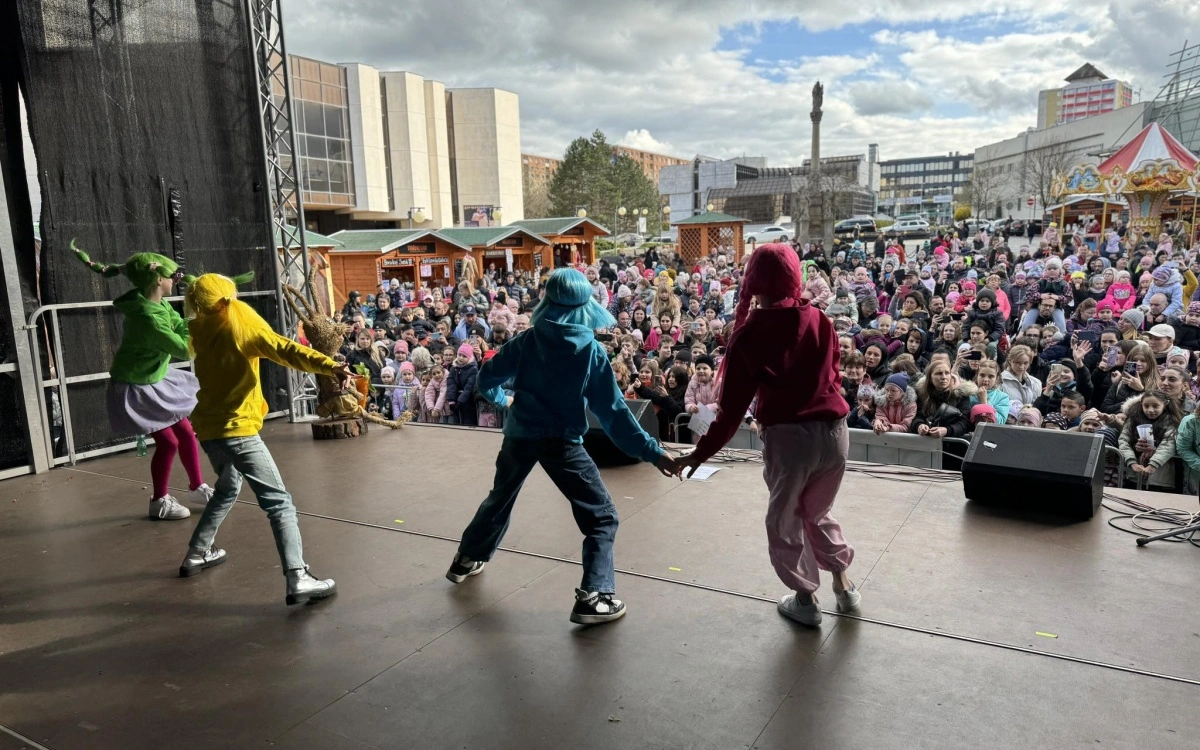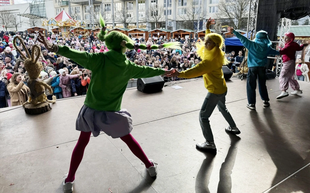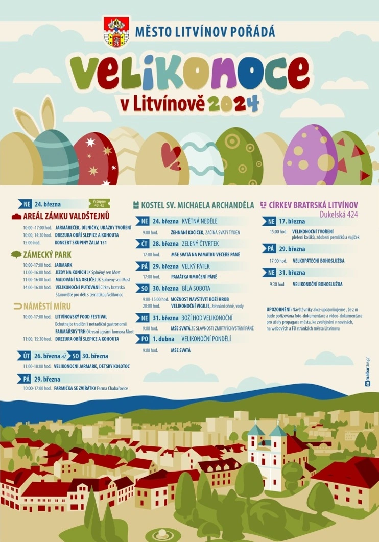 Velikonoční veselice začala v neděli i v Litvínově. Zaujala hlavně obří slepice s ještě větším kohoutem, které "drezúroval" růžový velikonoční zajíček. Opeřenci s ušákem se předvedli jak na nádvoří zámku, tak potěšili návštěvníky foodfestivalu na náměstí Míru. I zde budou oslavy svátku jara pokračovat.