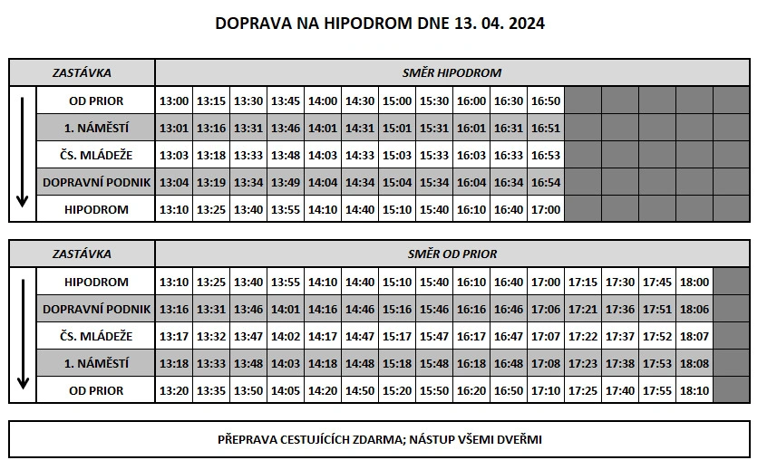 Bezplatná linka bude vyjíždět od obchodního domu Prior, přes 1. náměstí, zastávku Čs. mládeže, Dopravní podnik s konečnou na Hipodromu. Zpět bude jezdit po stejné trase. Autobusy budou označeny nápisem HIPODROM. První autobus vyjede od OD Prior ve 13 hodin. Vstupné na hipodromu je možno zakoupit od 10.30, přičemž možná je platba pouze v hotovosti.