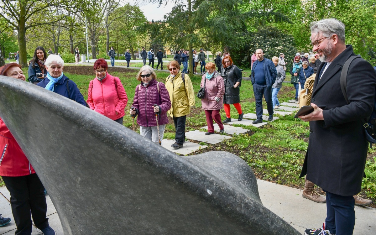 Paměťníci ve čtvrtek absolvovali dendrologickou prohlídku parku. Na jeho proměně se podílel i arborista. Ten například navrhl pás lučního kvítí podél Bělehradské třídy, a to v prostoru za kolektorem. Foto: město Most