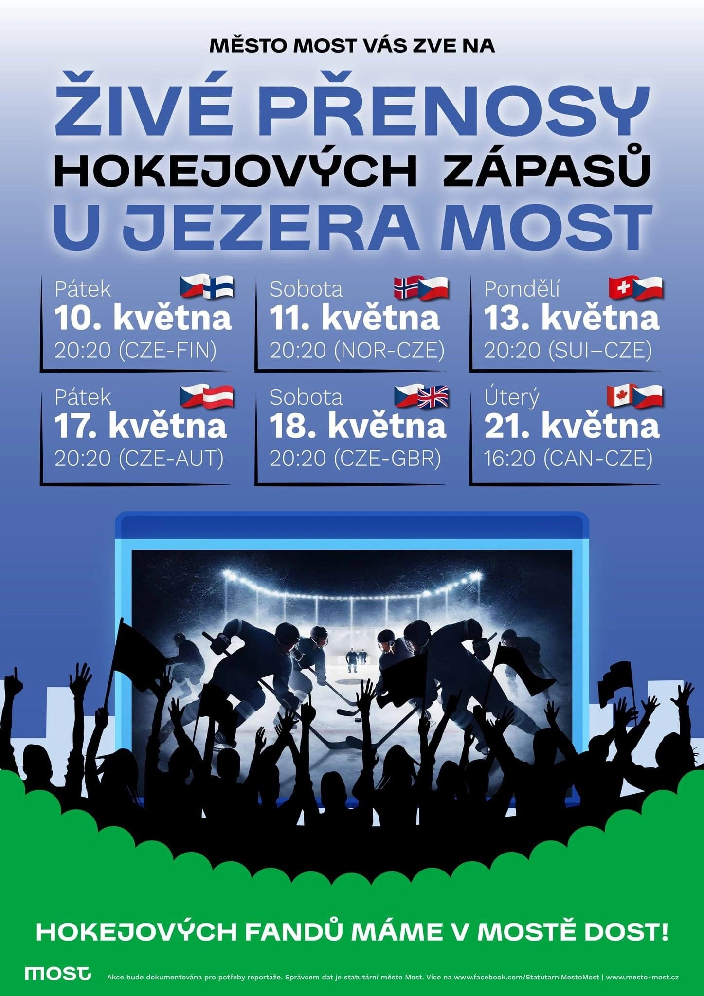 Most – Už dnes startuje hokejové mistrovství světa, navíc na domácí půdě. O to více je přání českých fanoušků vyhrát vřelejší. Vždyť co je víc, než získat titul před vlastními fanoušky. Do centra dění se dostane jen málokdo. Společné sledování zápasů má nicméně skvělou atmosféru všude, proto se fanoušci domlouvají, kde se sejdou. Nezapomenutelnou kulisu nabídne přenos domácích zápasů na břehu jezera Most.