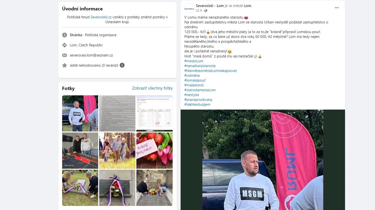 Lom u Mostu – Vlnu zájmu vzbudil na sociálních sítích příspěvek bývalého vedení města Lom u Mostu z politického uskupení Severočeši. Ve středu se na jejich profilu na sociální síti Facebook objevil příspěvek, že se „nenažraný starosta“ nestyděl říct si o 120 tisíc korun jako odměnu za povedenou pouť. Ta se konala o víkendu, zasedání města v úterý.
