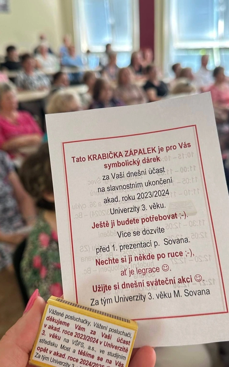 Nejen osvědčení, ale i vtipný dárek s tajuplným vzkazem si převzali absolventi Univerzity 3. věku. Foto: město Most