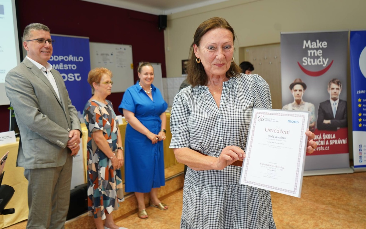 Most není výjimkou – několik desítek aktivních seniorů absolvovalo další sérii kurzů, které pro ně již řadu let připravuje Vysoká škola finanční a správní. Univerzitu 3. věku finančně podporuje i město Most. Osvědčení o absolvování kurzů seniorům předal ředitel místního studijního střediska školy VŠFS Josef Švec společně s náměstkyní primátora Markétou Starou.