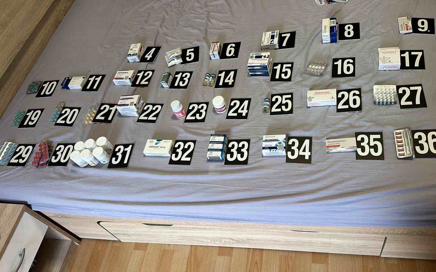 Policie zajistila desetitisíce tablet a vialek obsahujících různé druhy látek s hormonálním účinkem zneužívané pro růst svalové hmoty a ke sportovnímu dopingu. Jejich celková hodnota v koncové distribuci by byla nejméně 1,5 milionu korun. Dále pak různá množství kokainu, klefedronu, mefedronu a marihuany.