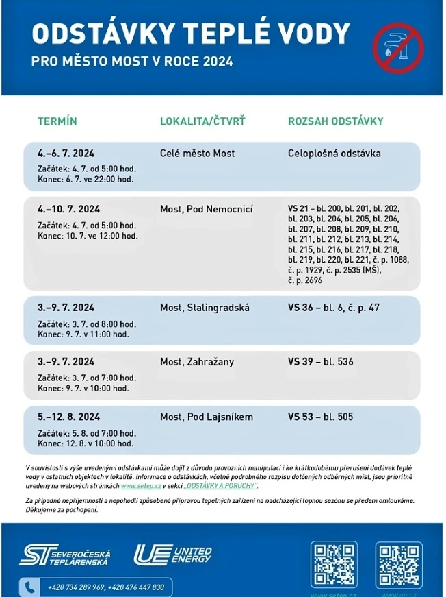 Společnosti Severočeská teplárenská a United Energy připravily na červencové svátky pravidelné letní technologické odstávky, během kterých budou prováděny nezbytné údržbové práce a rekonstrukce tepelného zařízení. Po dlouhých 10 letech přistoupily k celoplošné odstávce, oproti minulosti nicméně velmi krátké.