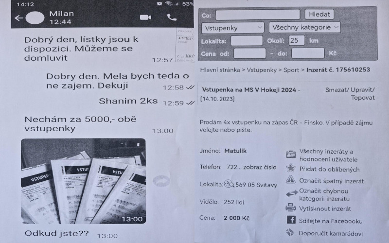 Na policii po celé České republice se obrátilo několik lidí, kteří přes sociální síť či bazarový portál objednali vstupenky například na hokejové utkání Česko-Finsko, koncert Hany Zagorové či Majáles 2024. Podvod probíhal klasickým způsobem, kdy podvodník chtěl poslat peníze na účet a dále chtěl zaslat mailem či přes whatsapp potvrzení o odeslání peněz. Kupující však čekali marně a lístků se nedočkali. Veškeré pokusy o kontakt s prodávajícím selhaly, nedočkali se tak ani navrácení svých peněz.