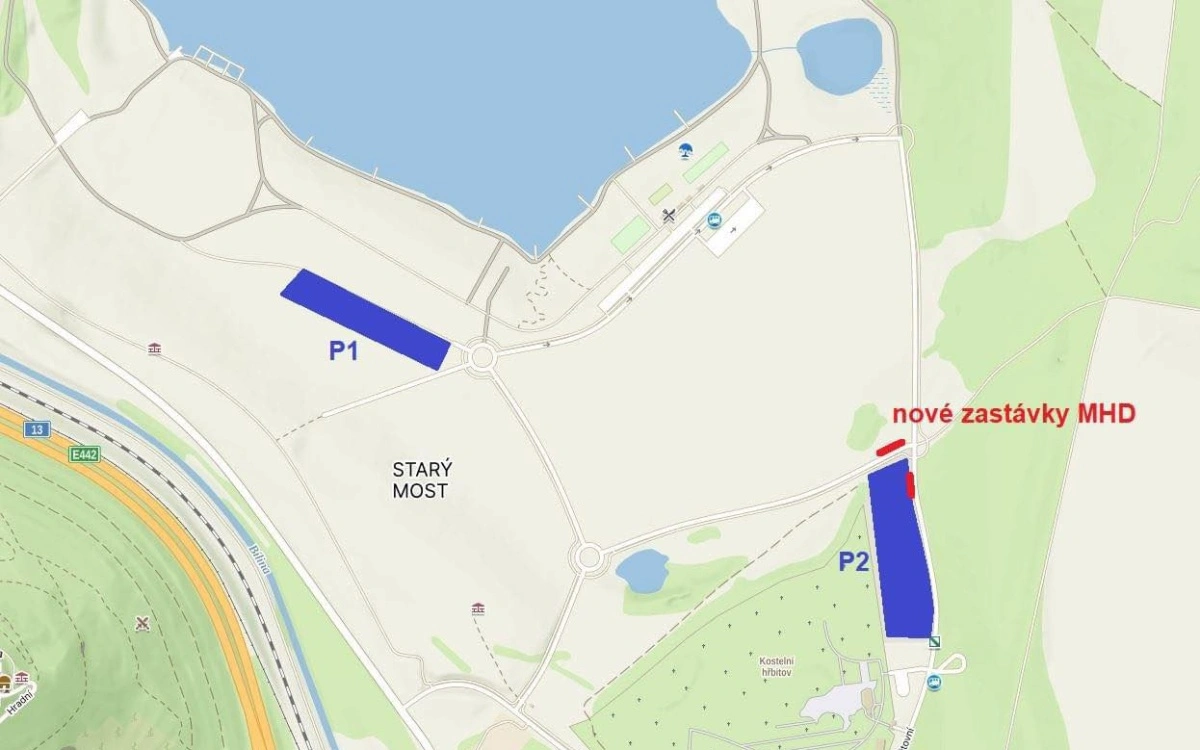 U jezera vznikla dvě nová záchytná parkoviště. Od toho u hřbitova se mohou lidé svést k jezeru zdarma. Zdroj: město Most
