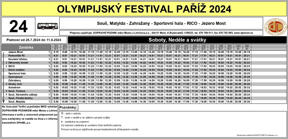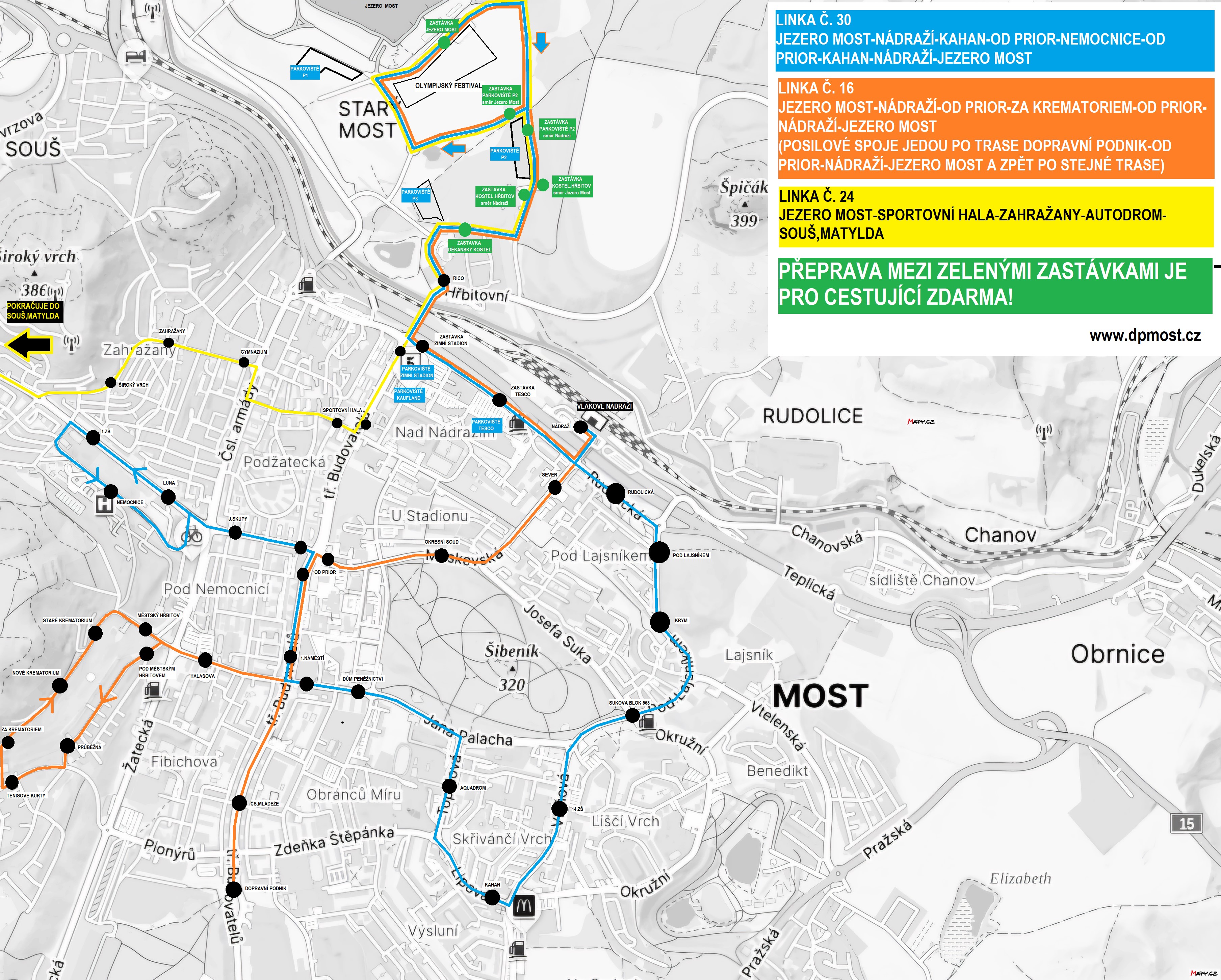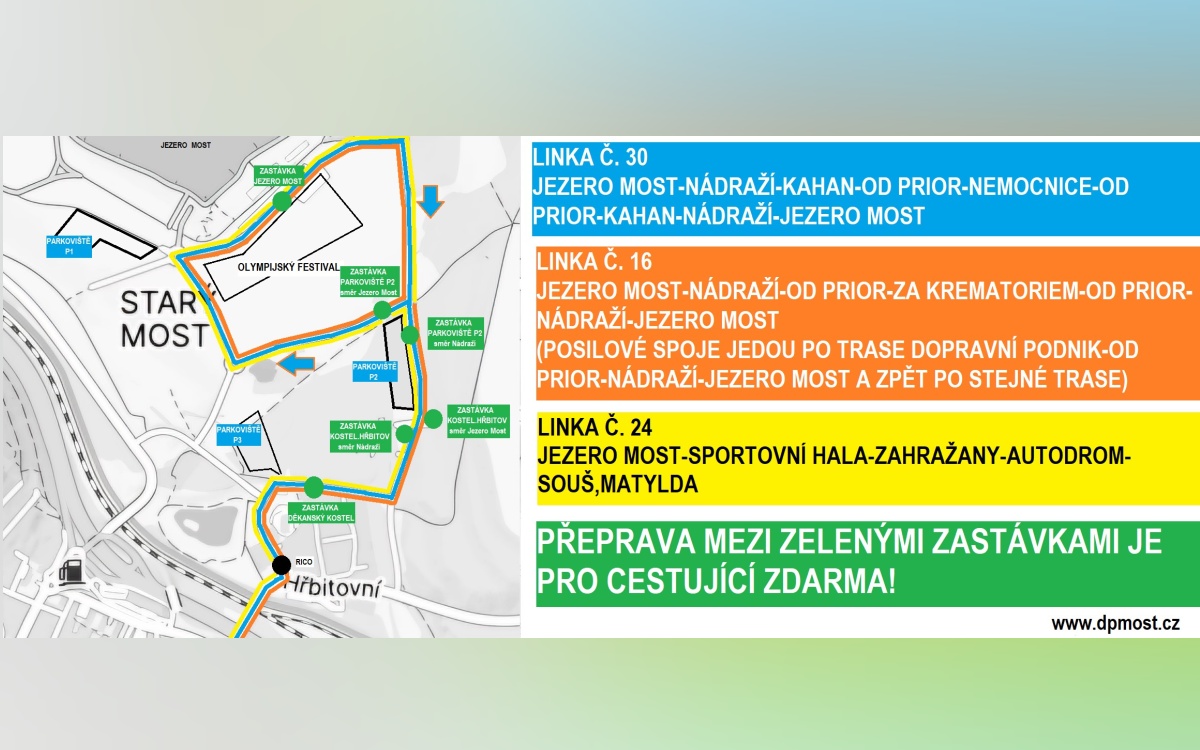 Z důvodu umožnění přepravy návštěvníků ze záchytných parkovišť (P2 a P3) na Olympijský festival k Jezeru Most, bude z vybraných zastávek do zastávky Jezero Most a zpět po dobu konání festivalu (od 26. 7. 2024 do 11. 8. 2024) zavedena pro cestující PŘEPRAVA ZDARMA.